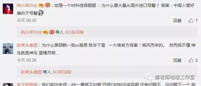 “理一个材料选择题题:为什么要大量从国外进口母蟹?答案:中国人爱好偏向于母蟹”“为什么黑颈鹤一到xx高原就会下雪一大堆官方答案!乘风而来的。然而我不懂神鸟就是神鸟雪精灵啊…”“我们政治老师:AB一看就不对啊四号D材料没体现啊还有问题不,没问题下一个我们:[黑人问号脸]”