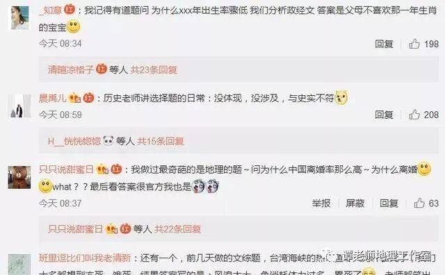 “我记得有道题问为什么xxx年出生率骤低我们分析政经文答案是父母不喜欢那一年生肖的宝宝”“历史老师讲选择题的日常:没体现,没涉及,与史实不符”“做过最奇葩的是地理的题~问为什么中国离婚率那么高~为什么离婚what??最后看答案很官方我也是”“还有一个,前几天做的文综题,台湾海峡的热带鱼冬天为什么死了,我们大多都想到冻死,饿死,结果答案写的是:风浪太大,鱼消耗体力过多,累死了。老师都笑出了声”