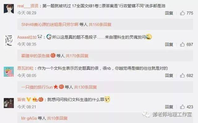 网友评论:“第一题就被坑过17全国文综1卷原答案是“行政管辖不同”说多都是泪”“所以这是真的题不是段子……来自理科生的灵魂发问”“作为一个文科生表示历史题真的很,很nb,你越觉得是错的往往就是对的”“就想问问我们文科生造的什么罪”“政治老师拿了一份历史卷的答案来给我们讲卷子,讲到一半才发现有问题”