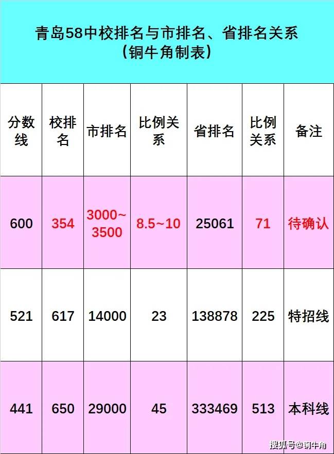 事实上,无论是青岛二中,还是青岛五十八中,校排名和市排名、省排名的比例并不是一个固定数值,不同的分数段,比例关系也会相应地发生变化。不同年份,生源水平不同,也会导致这个比例关系会有所晃动。