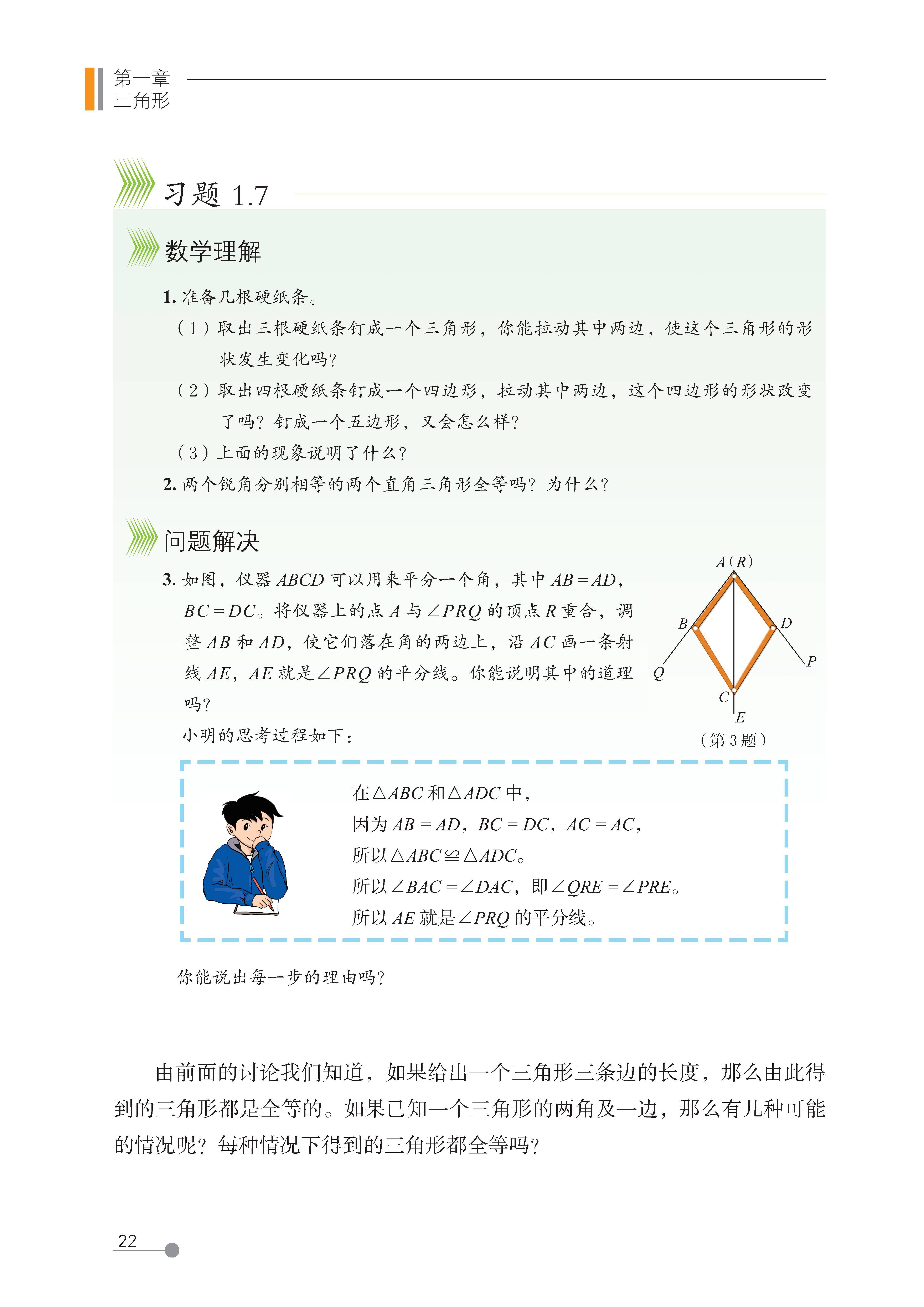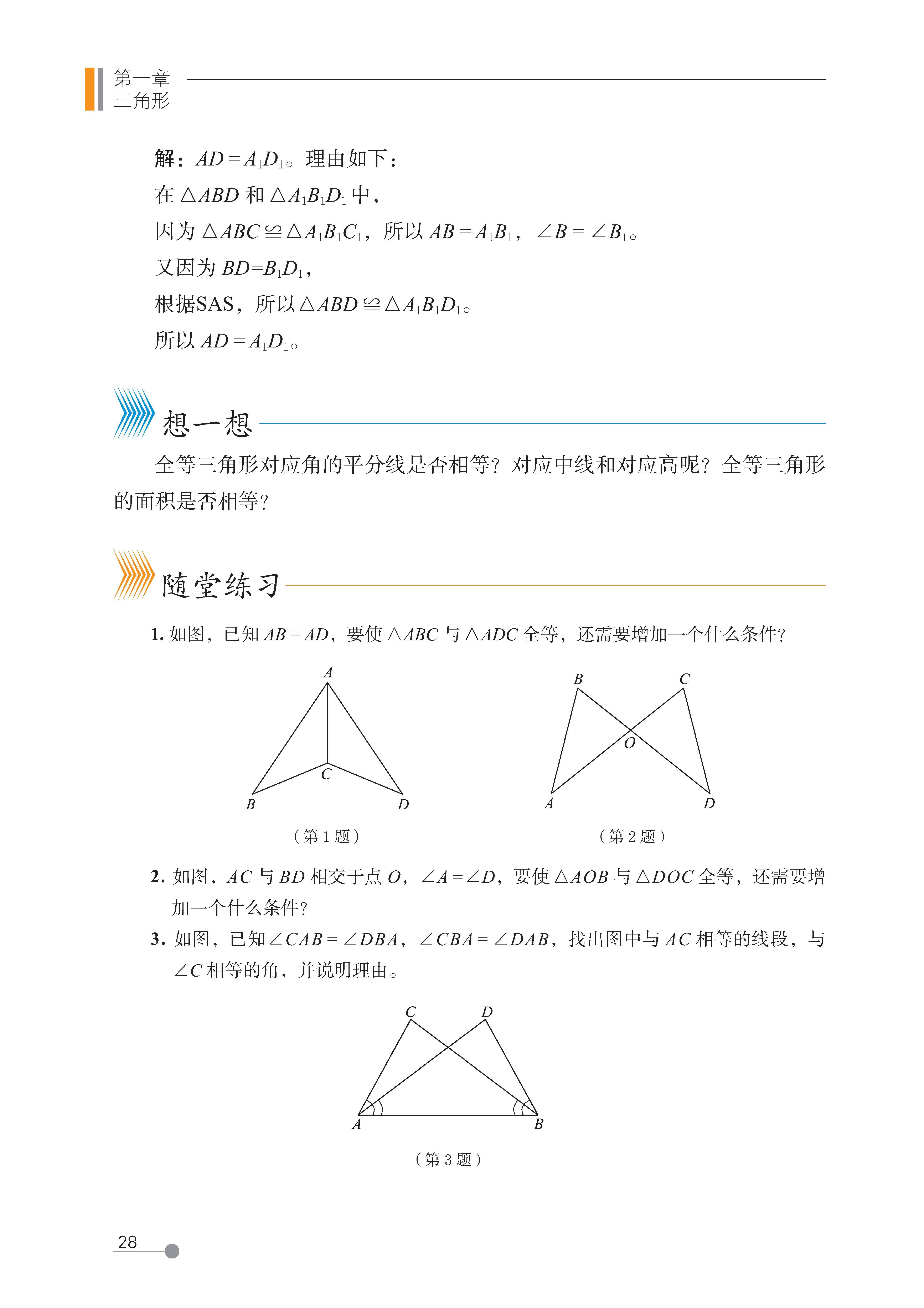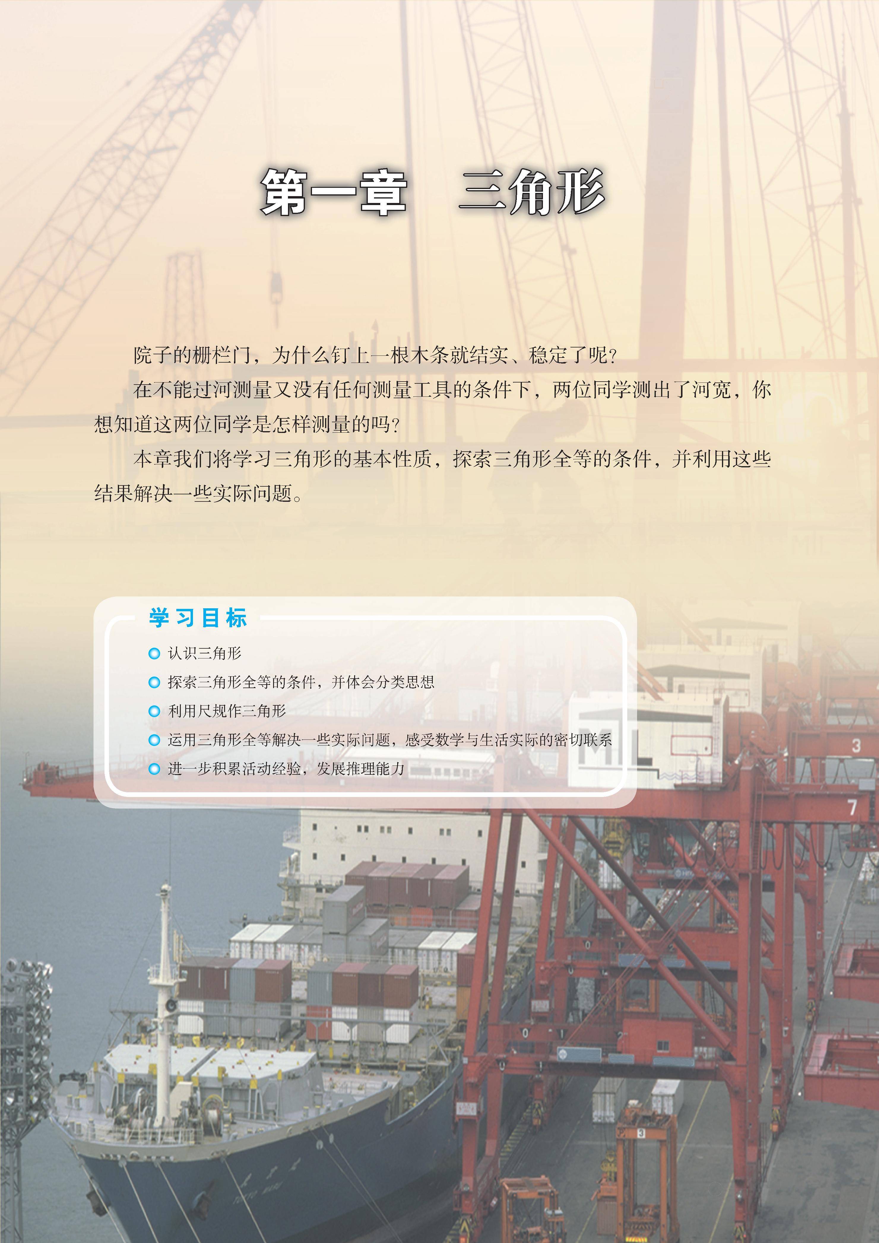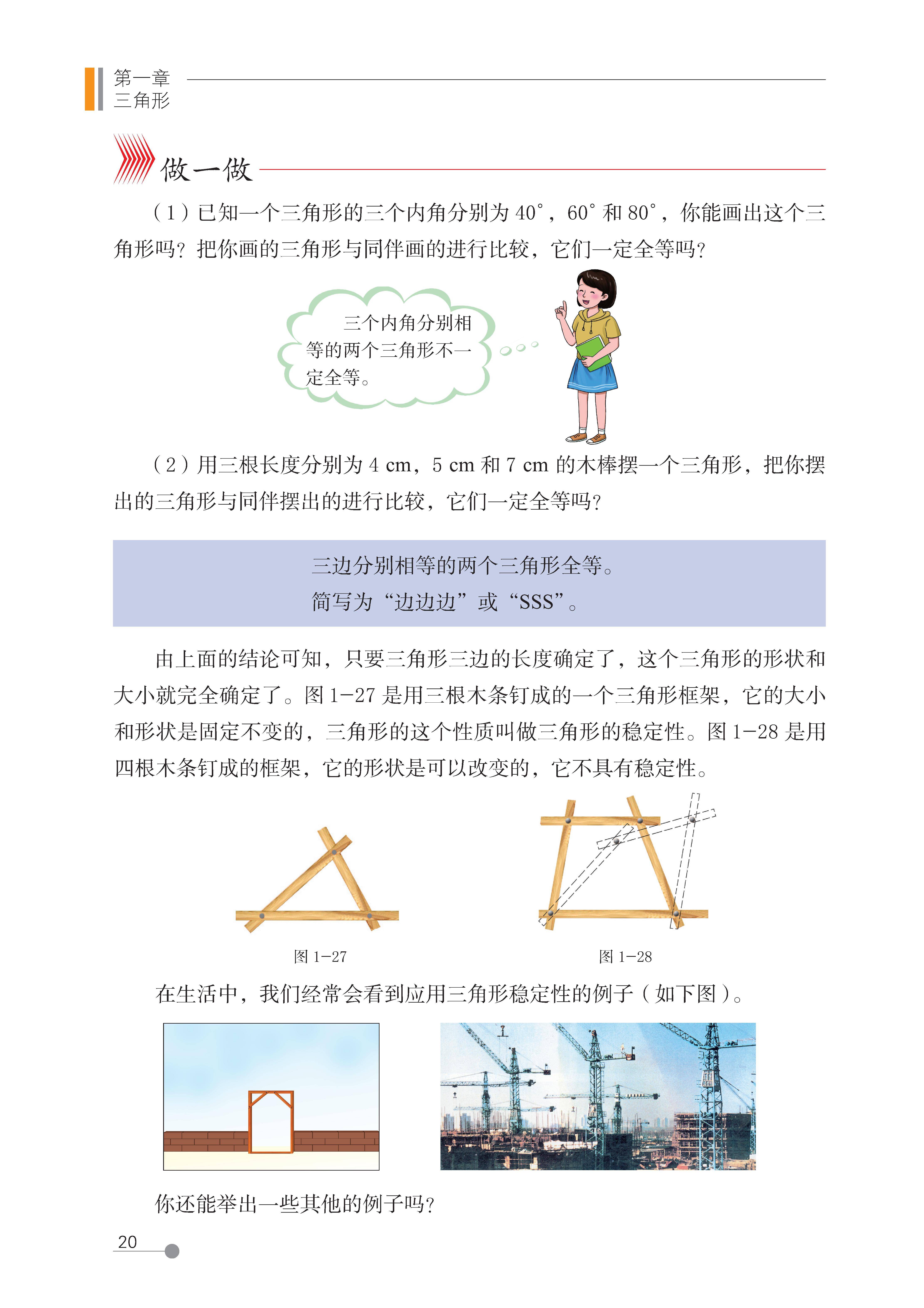 应用场景:已知两个三角形的三条边对应相等(如 “用三根固定长度的木条钉三角形,形状大小唯一”,体现三角形的稳定性)。