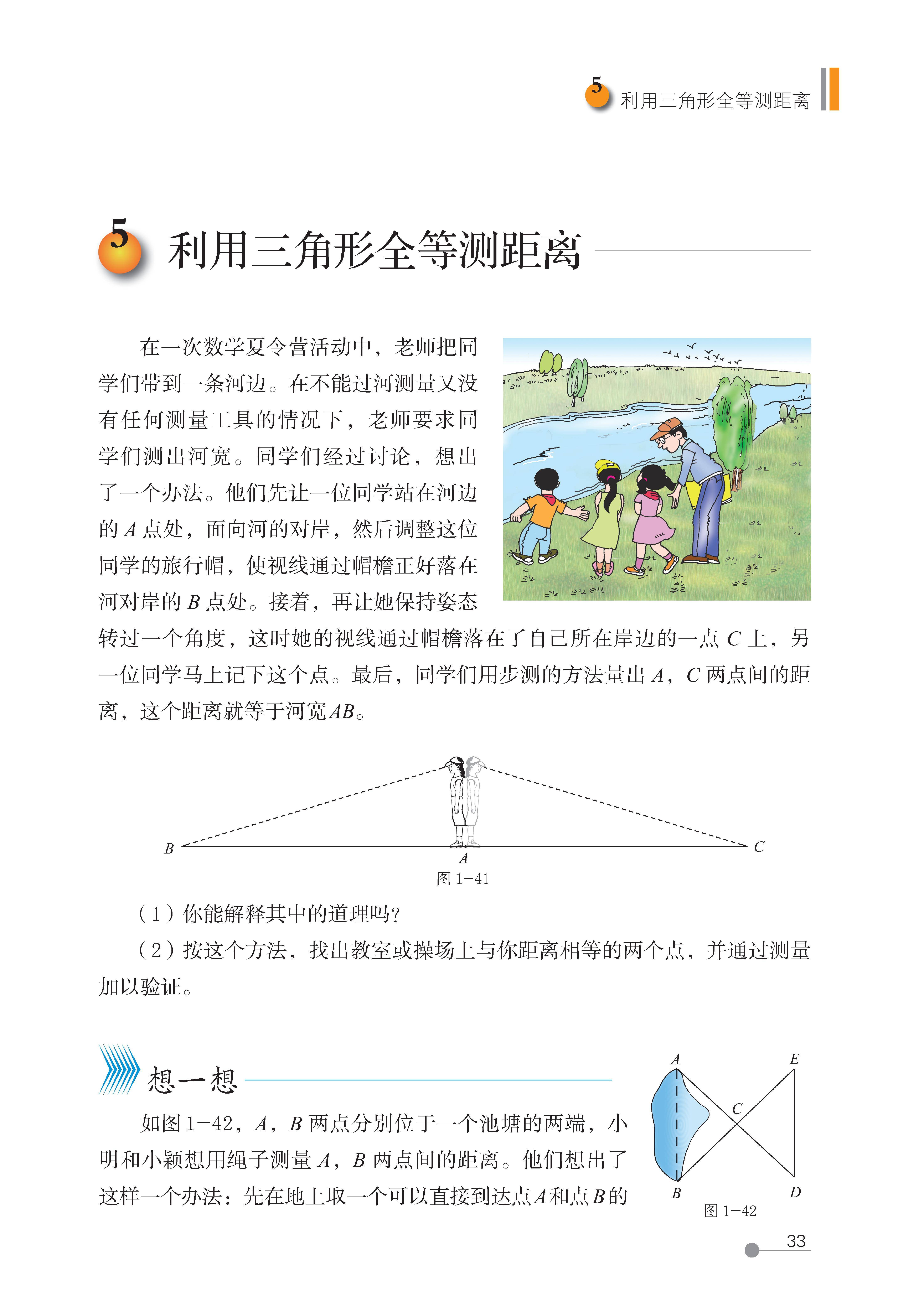 测量池塘两端 A、B 的距离:在平地上取一点 C,连接 AC、BC 并延长,使 CD=AC、CE=BC,连接 DE,测量 DE 的长度即为 AB 的长度(依据 SAS:△ABC ≌ △DEC,故 AB=DE)。