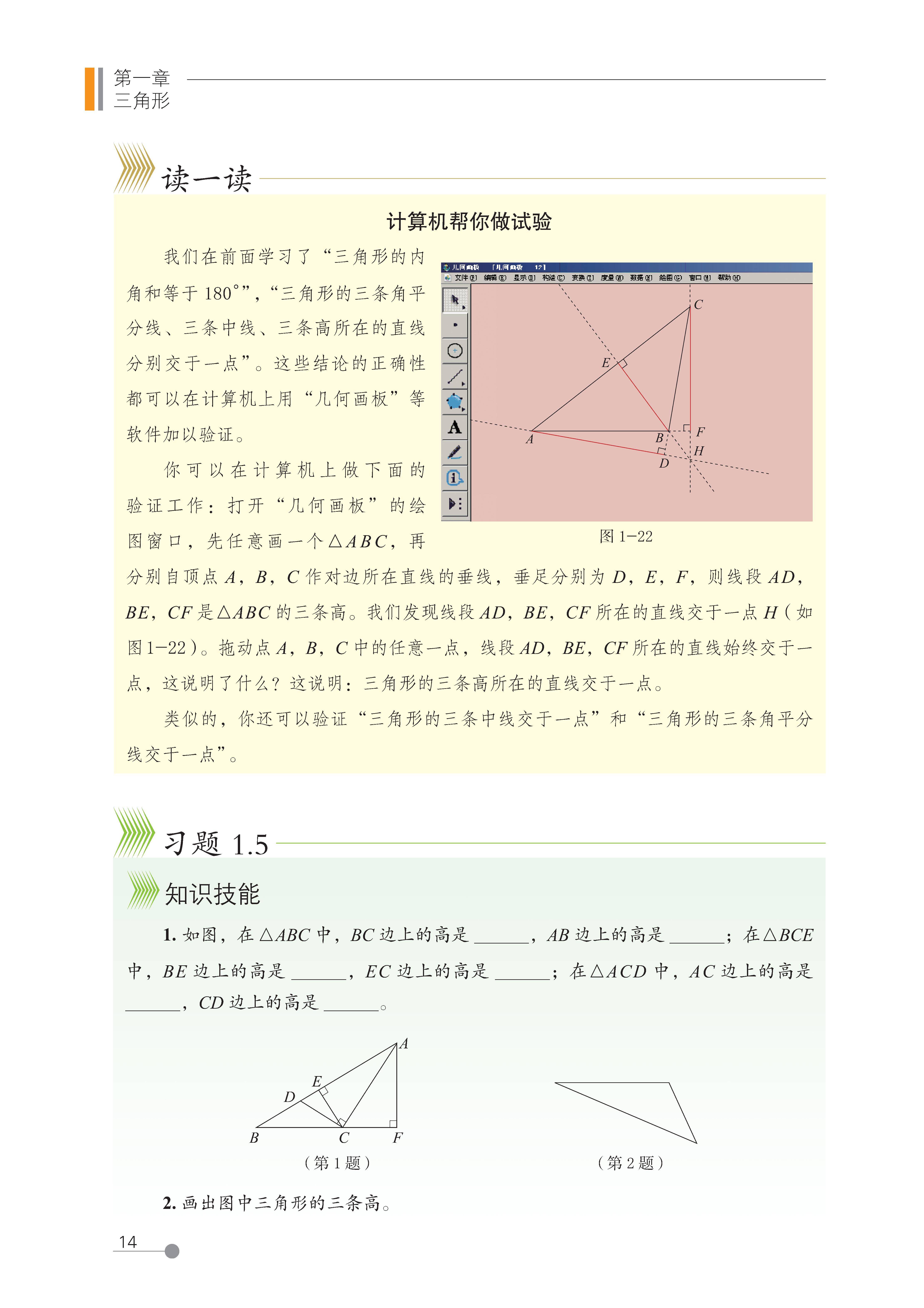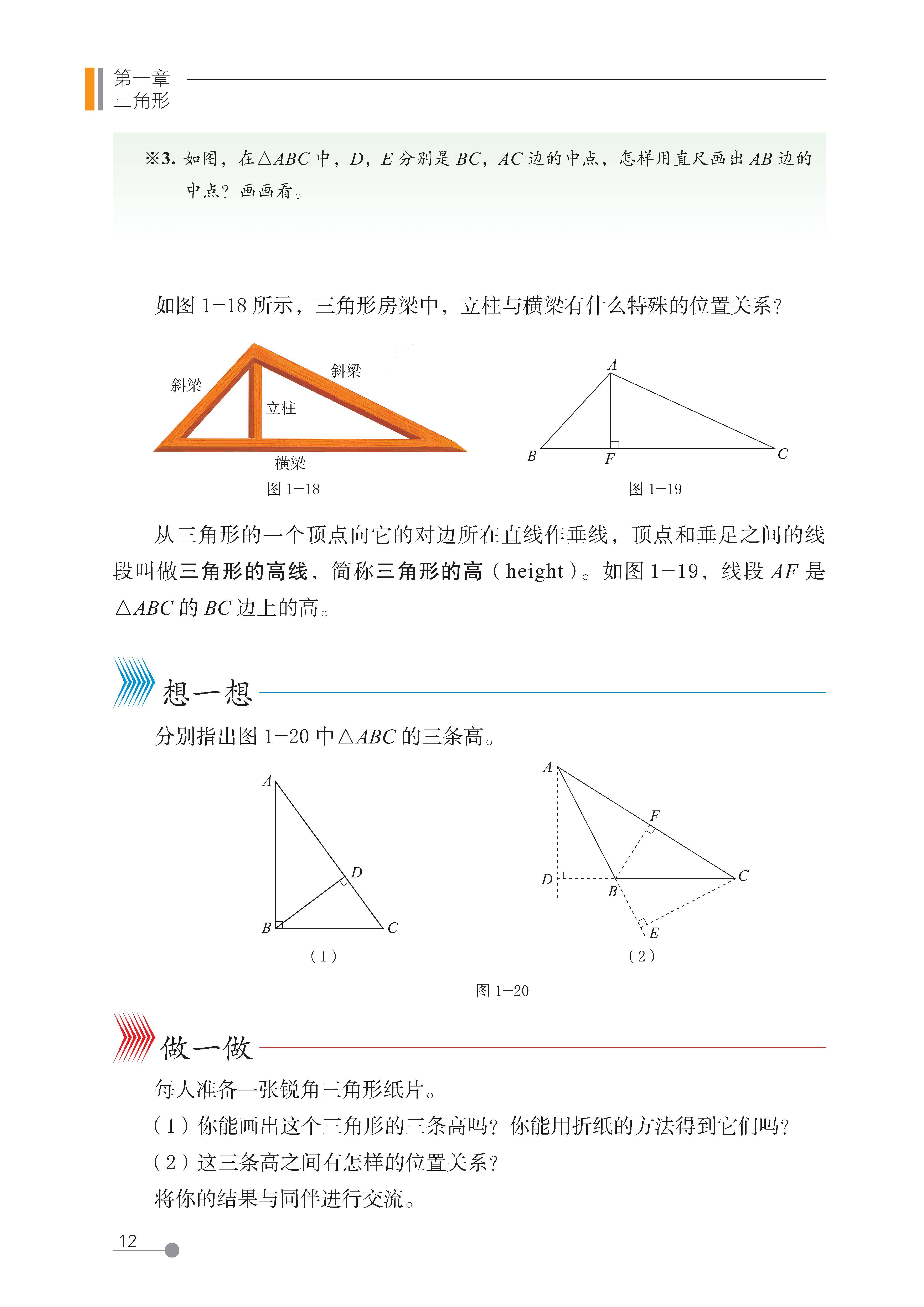 高线(高) 从三角形的一个顶点向它的对边所在直线作垂线,顶点与垂足之间的线段 ① 锐角三角形三条高在内部;直角三角形两条高与直角边重合,一条在内部;钝角三角形两条高在外部,一条在内部;② 三角形三条高交于一点(垂心)