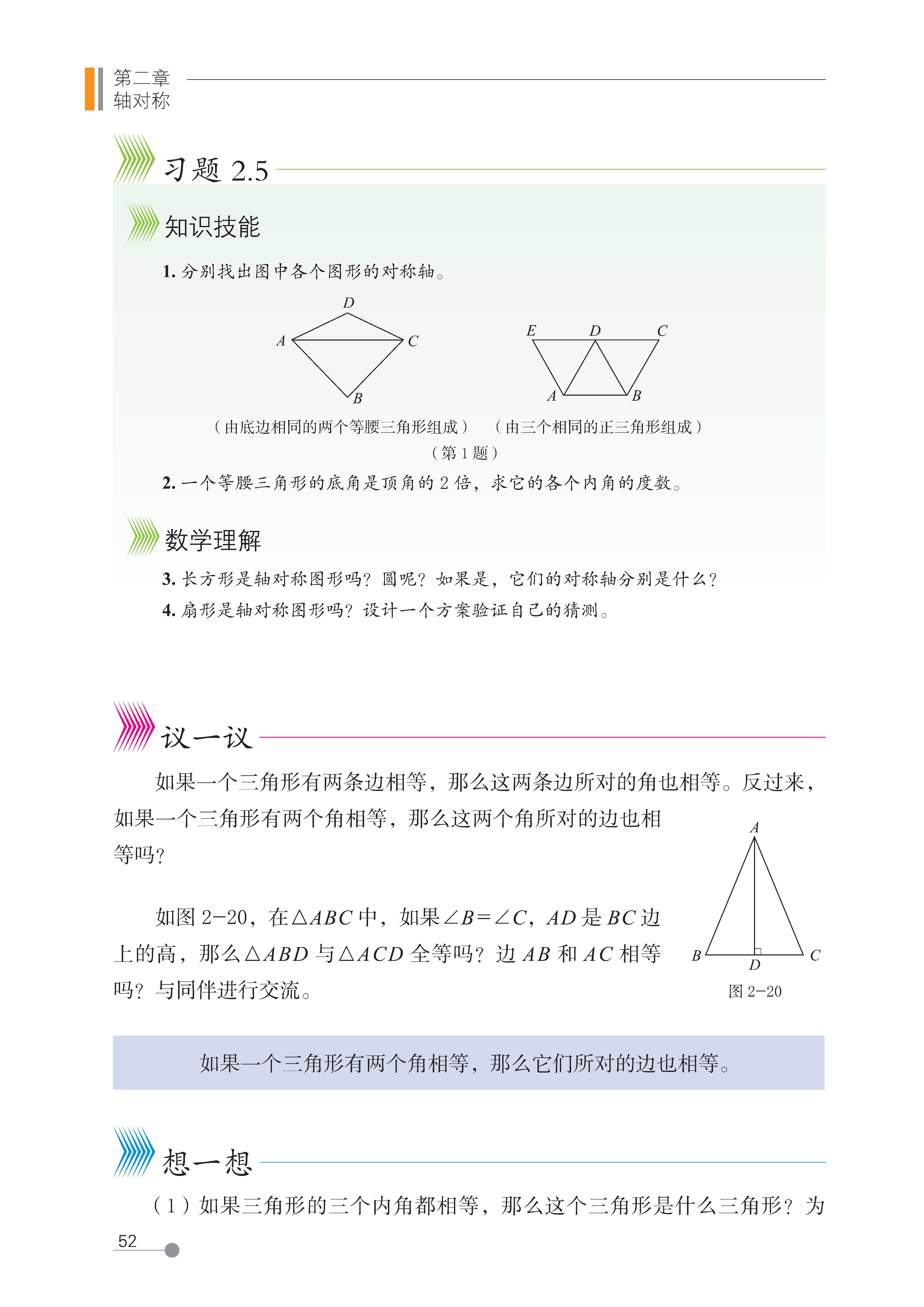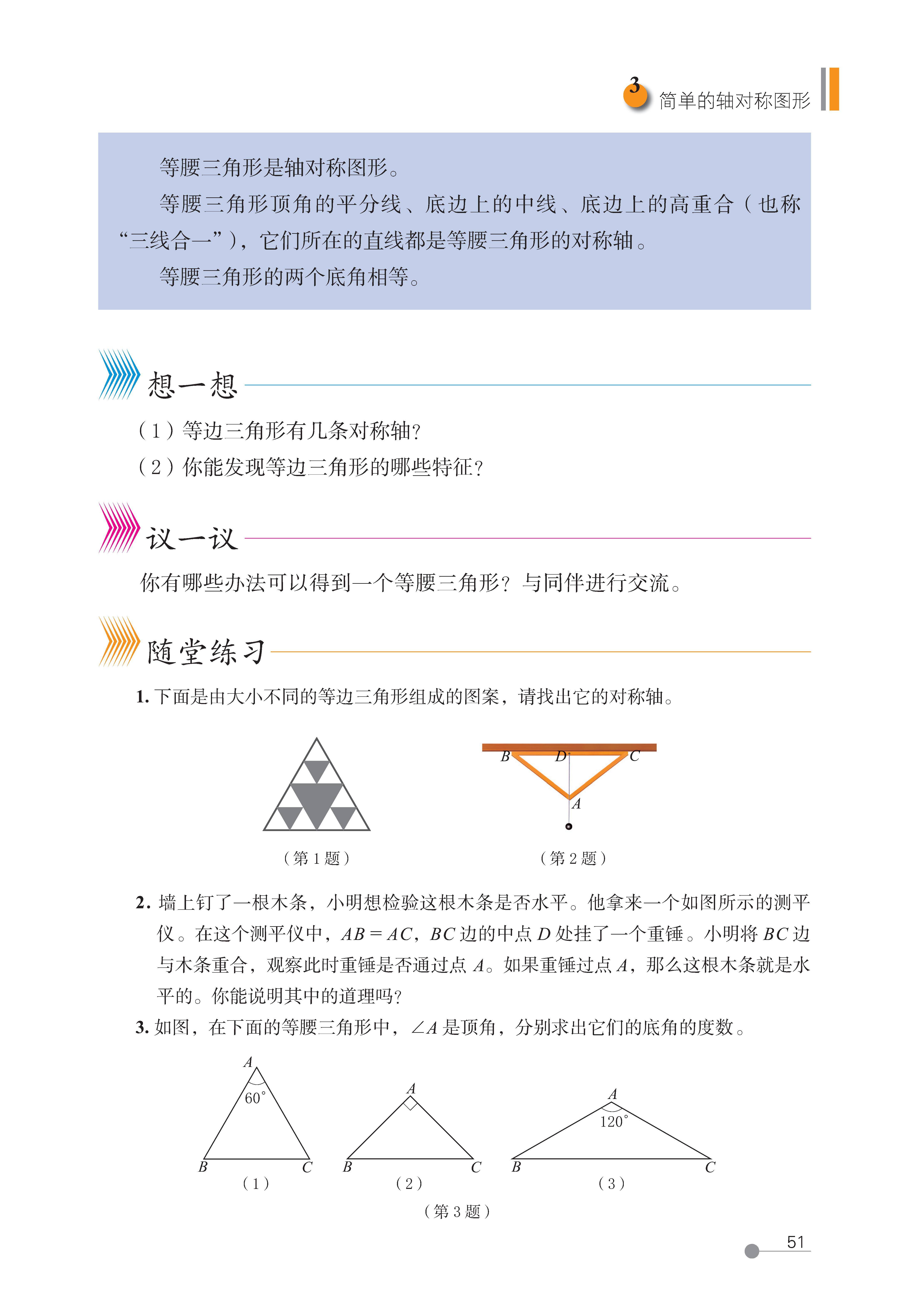 等腰三角形 有两条边相等的三角形(相等的边叫 “腰”,第三边叫 “底边”;两腰的夹角叫 “顶角”,腰与底边的夹角叫 “底角”)