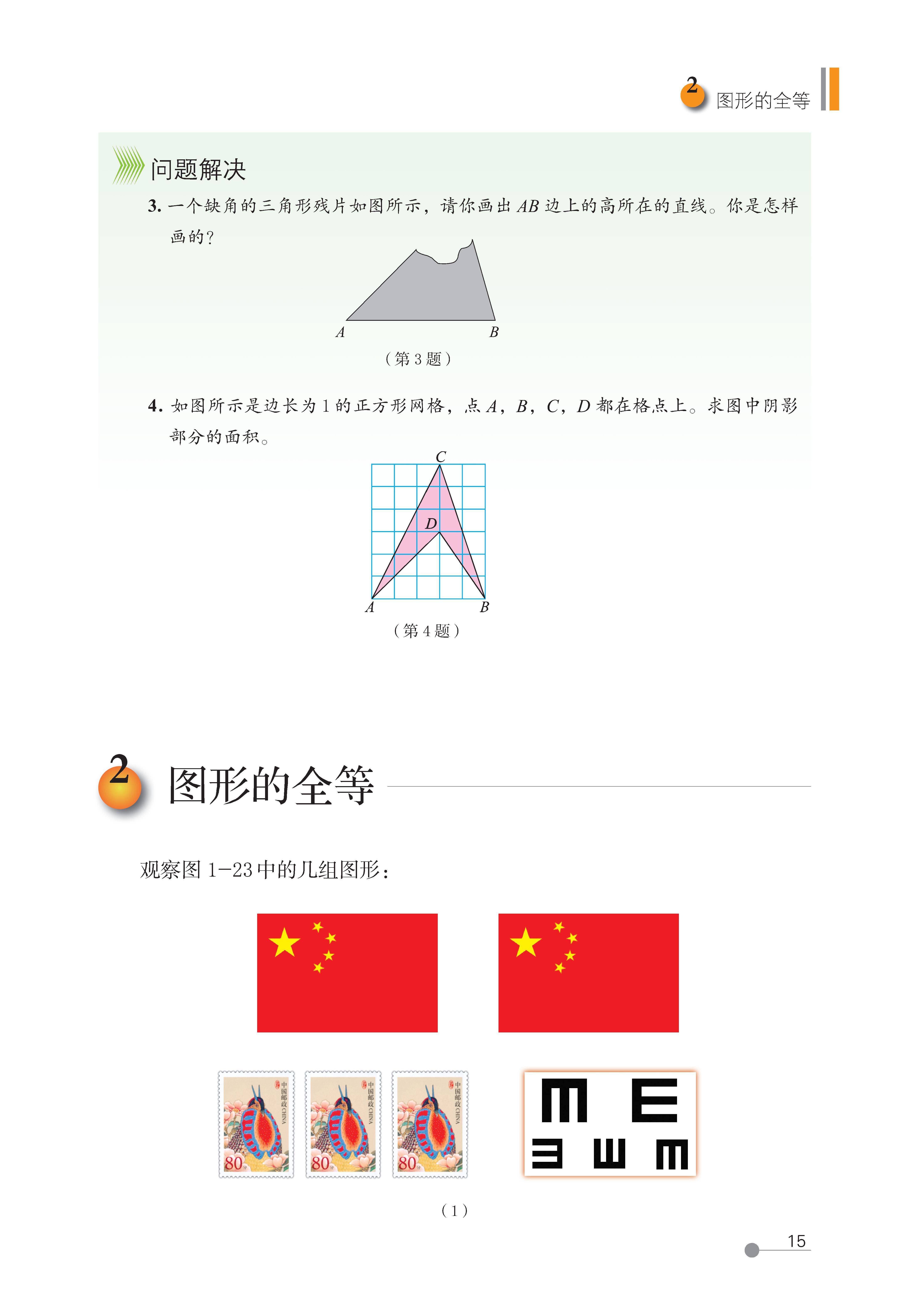 特征:全等图形的对应边相等、对应角相等(后续全等三角形性质的基础)。