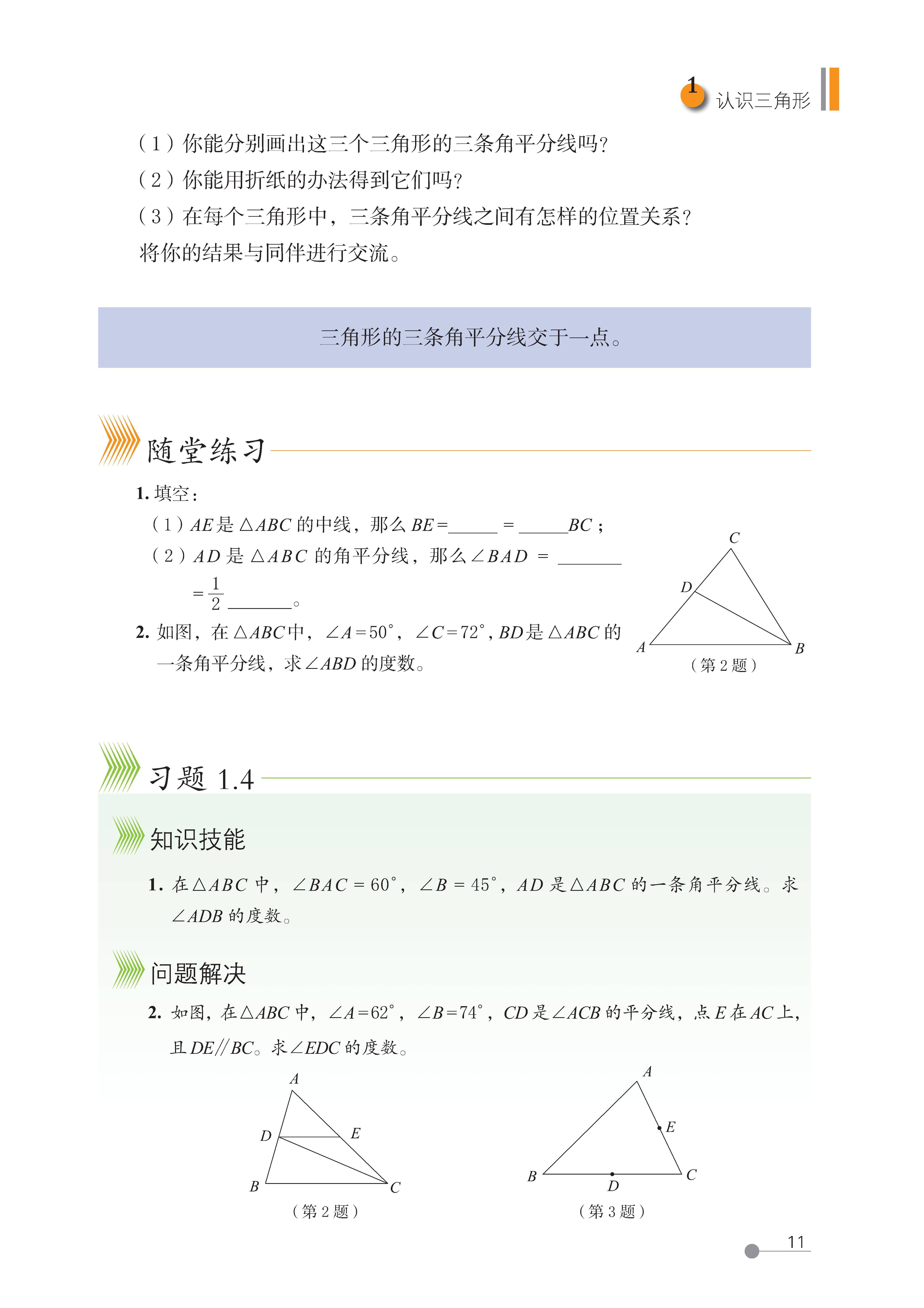 角平分线 三角形一个内角的平分线与对边相交,顶点与交点之间的线段 ① 平分内角(将内角分成两个相等的角);② 三角形三条角平分线交于一点(内心,内心到三边的距离相等)