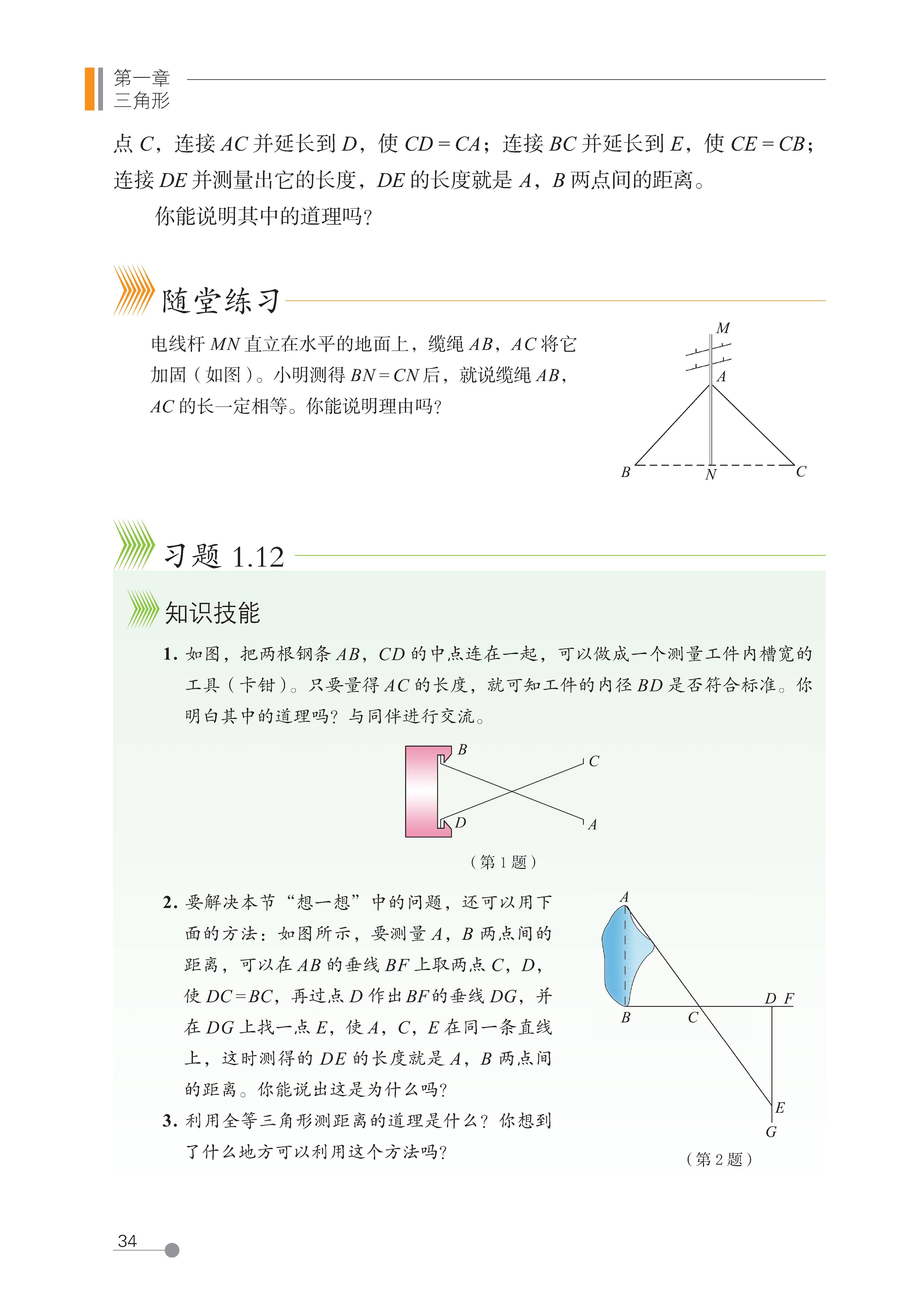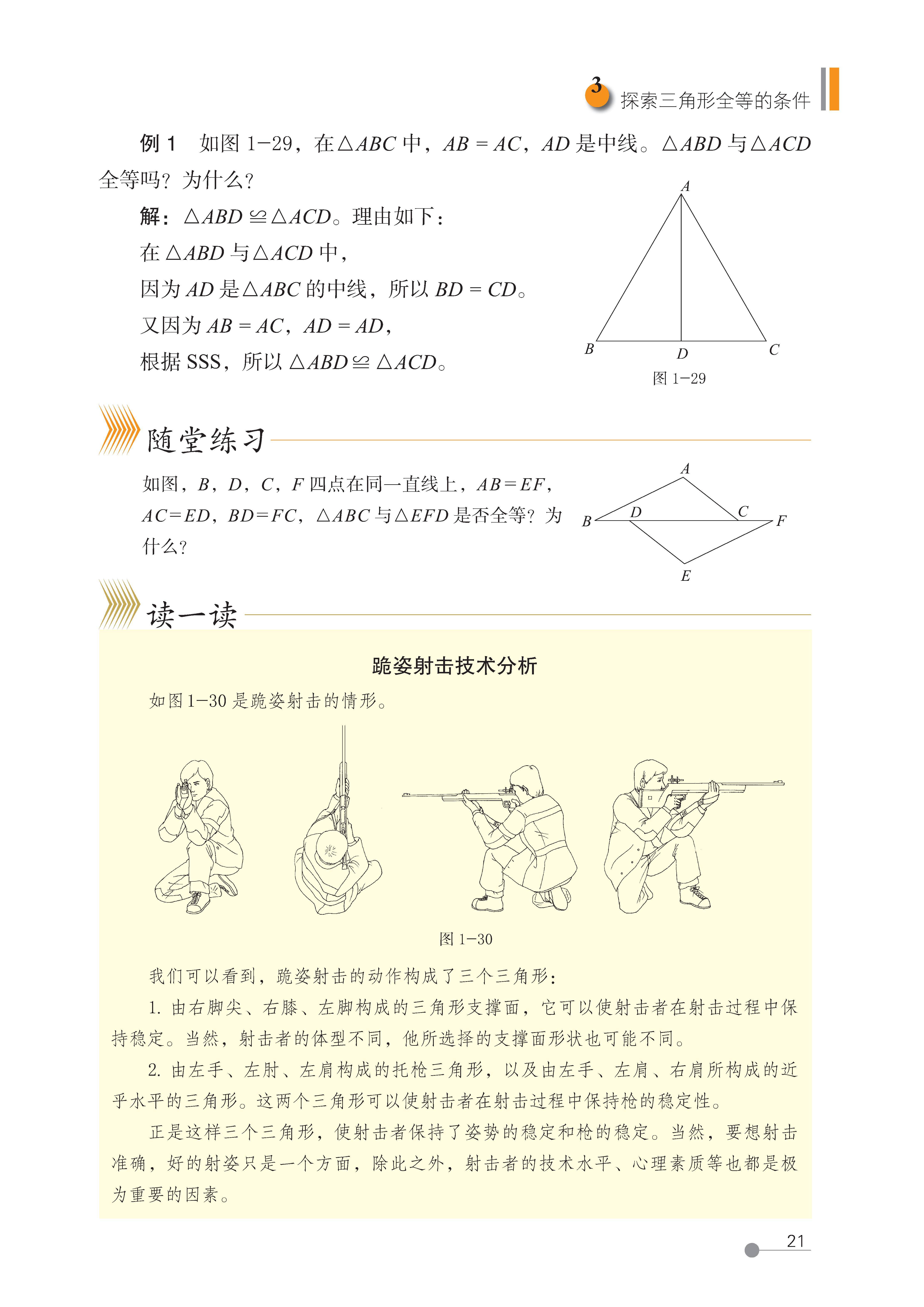 应用场景:已知两个三角形的三条边对应相等(如 “用三根固定长度的木条钉三角形,形状大小唯一”,体现三角形的稳定性)。