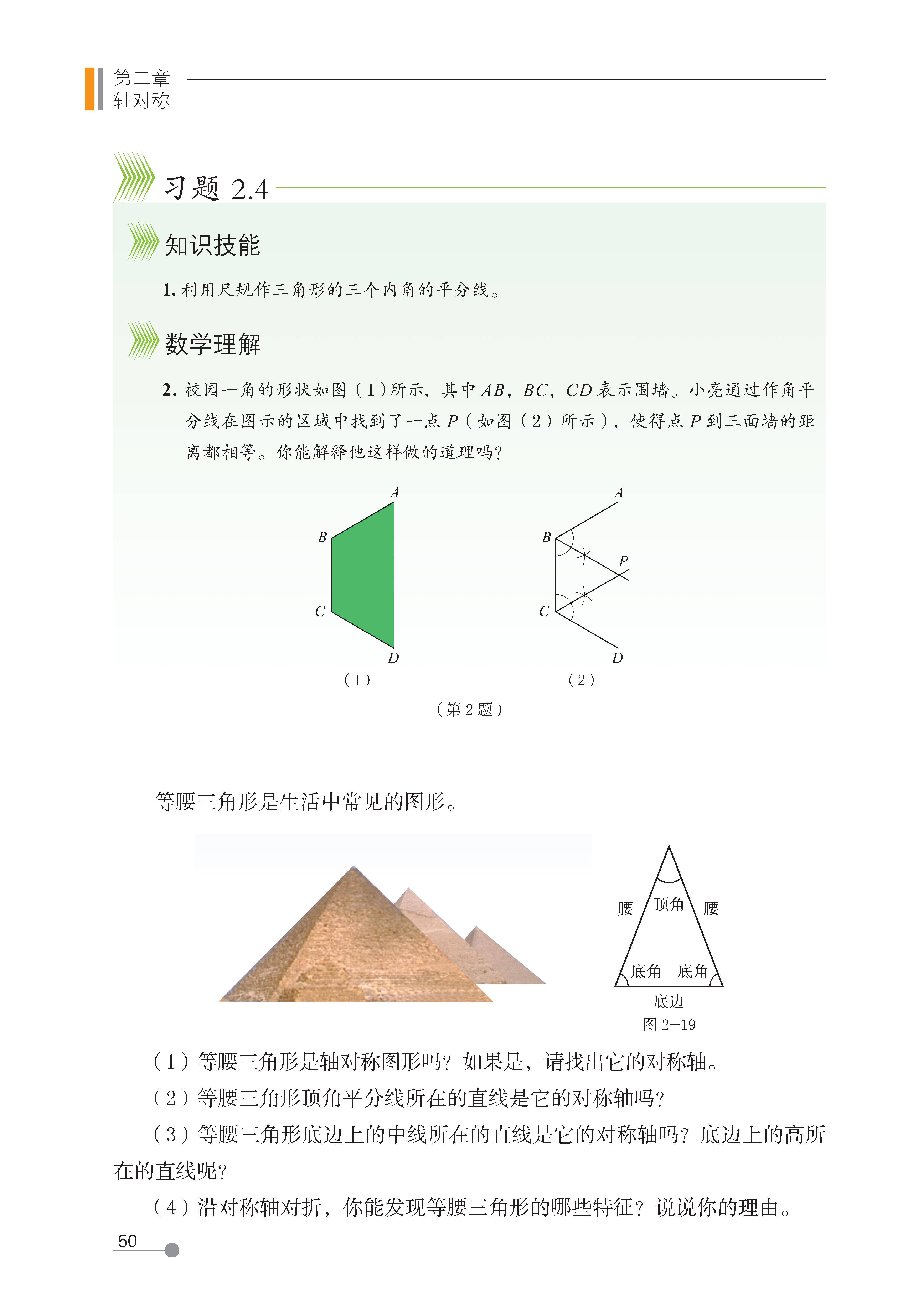 等腰三角形 有两条边相等的三角形(相等的边叫 “腰”,第三边叫 “底边”;两腰的夹角叫 “顶角”,腰与底边的夹角叫 “底角”)