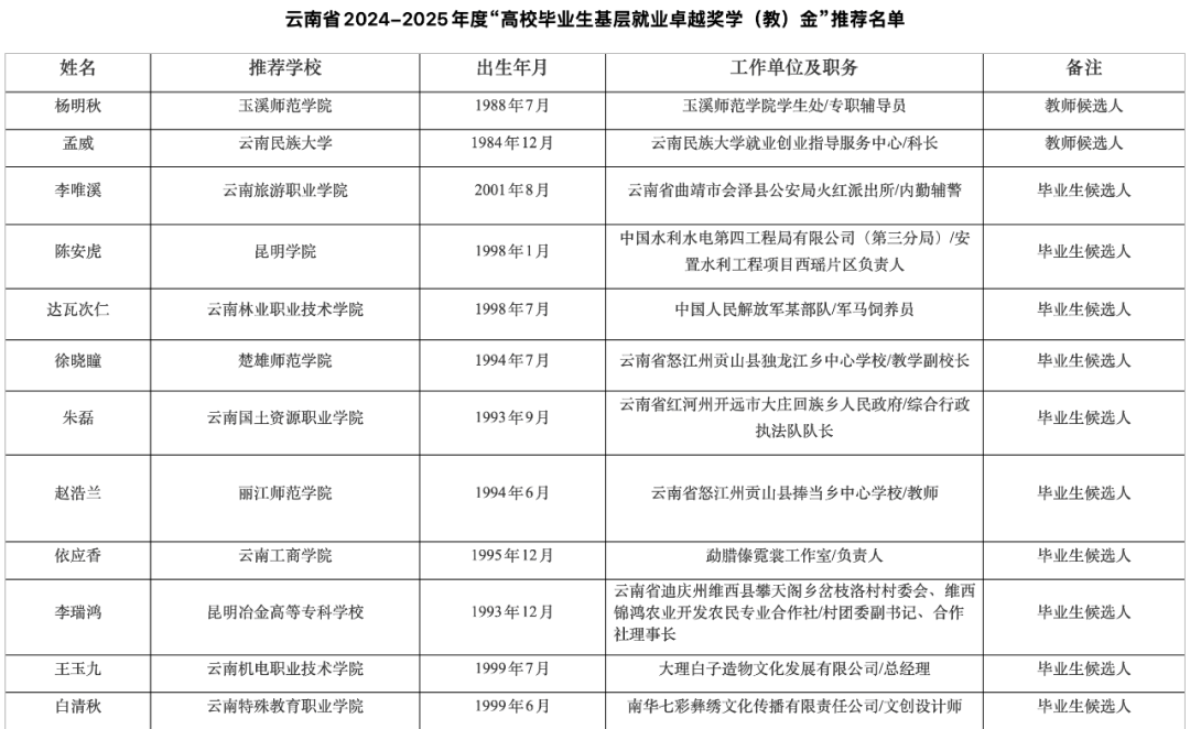 按照教育部司局《关于转发〈关于开展2024-2025年度“高校毕业生基层就业卓越奖学(教)金”推荐工作的通知〉》要求,经组织高校推荐、专家评审和综合考核,共推荐云南高校教师候选人2名、高校毕业生候选人17名。