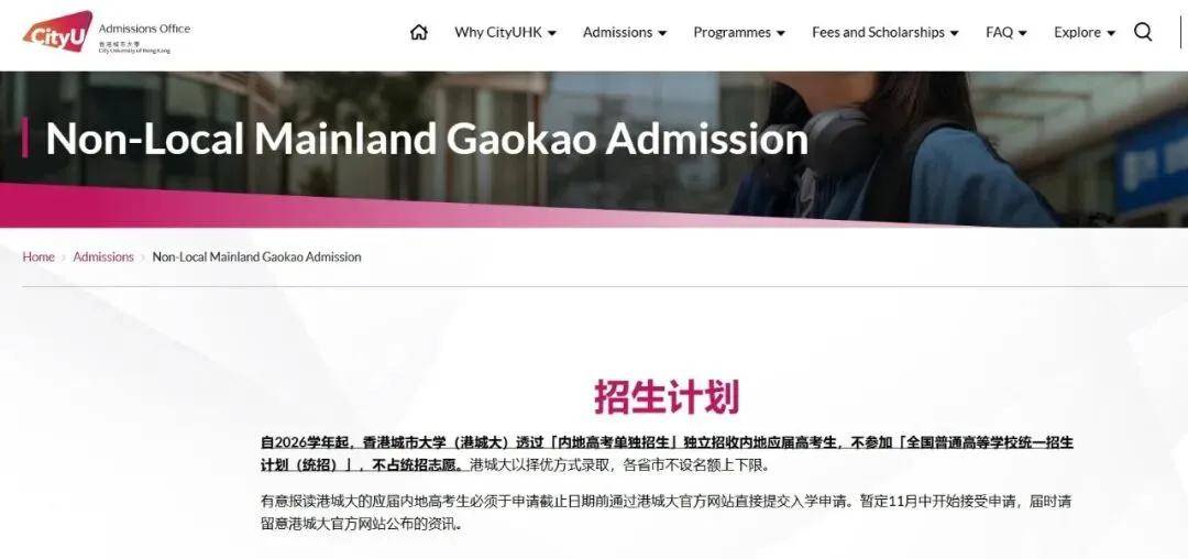 近日,香港城市大学重磅宣布,从2026学年开始,退出高考统招,改为独立招收内地应届高考生。
