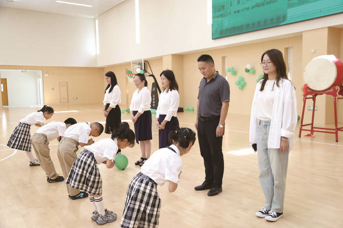 随后,一年级全体教师上台,新生代表向老师行鞠躬礼,全体一年级学生同步起立行拜师礼,尊师重道的种子悄然播撒心田。