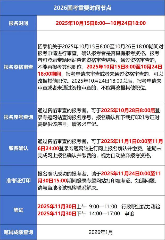 据悉,中央机关及其直属机构2026年度考试录用公务员报名即将开始,共计划招录3.81万人。考生可于10月15日8:00至10月24日18:00期间登录“中央机关及其直属机构2026年度考试录用公务员专题网站”(http://bm.scs.gov.cn/kl2026)进行网上报名,公共科目笔试将于11月30日在全国各直辖市、省会城市、自治区首府和部分城市同时举行。
