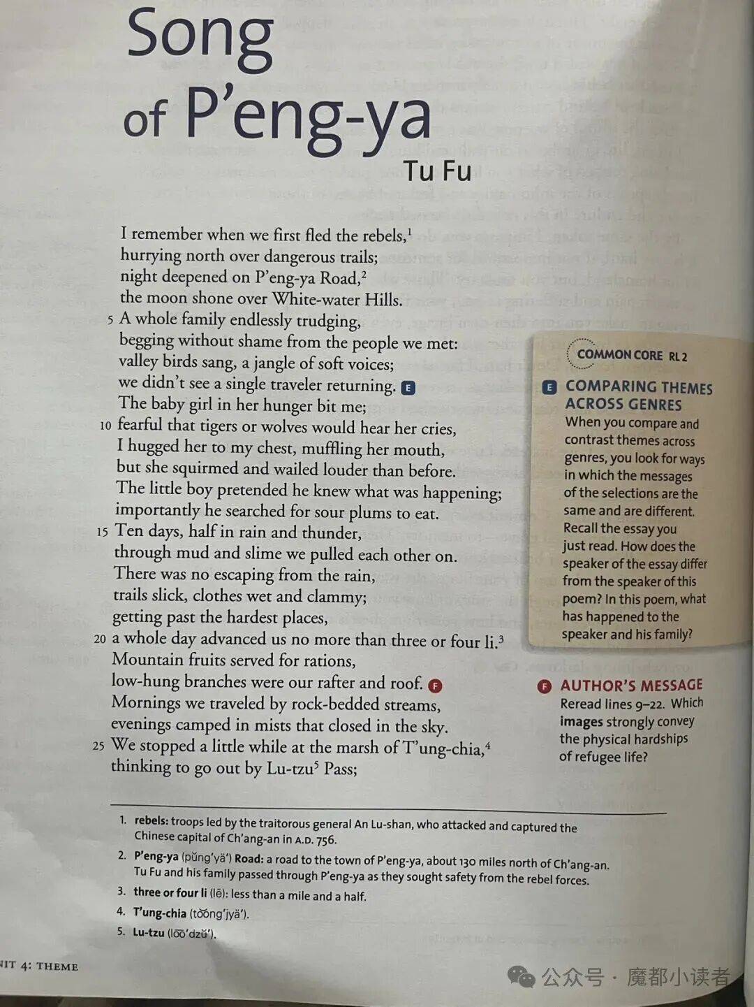 言归正传,我在图一 《美国文学》中发现的两位大诗人是陶潜(9年级教材第四单元)和杜甫(10年级教材第四单元),说明编辑对中国古代诗人是很了解的。
