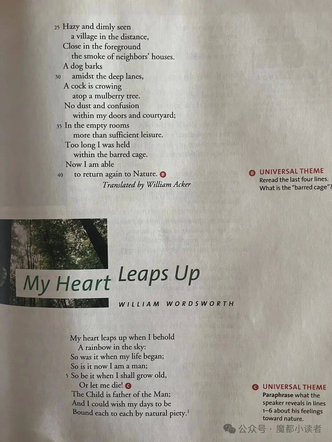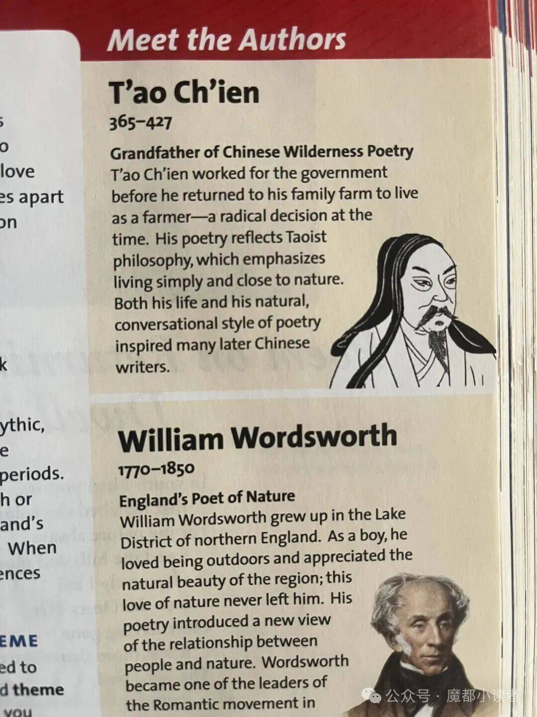 书中,陶潜跟英国诗人华兹华斯属于同一单元, 对陶渊明的介绍是:中国田园诗(wilderness poetry)鼻祖,他从政后归隐田园——这在当时是很激进的决定。他的诗歌反映了道家哲学,强调简朴生活和贴近自然。