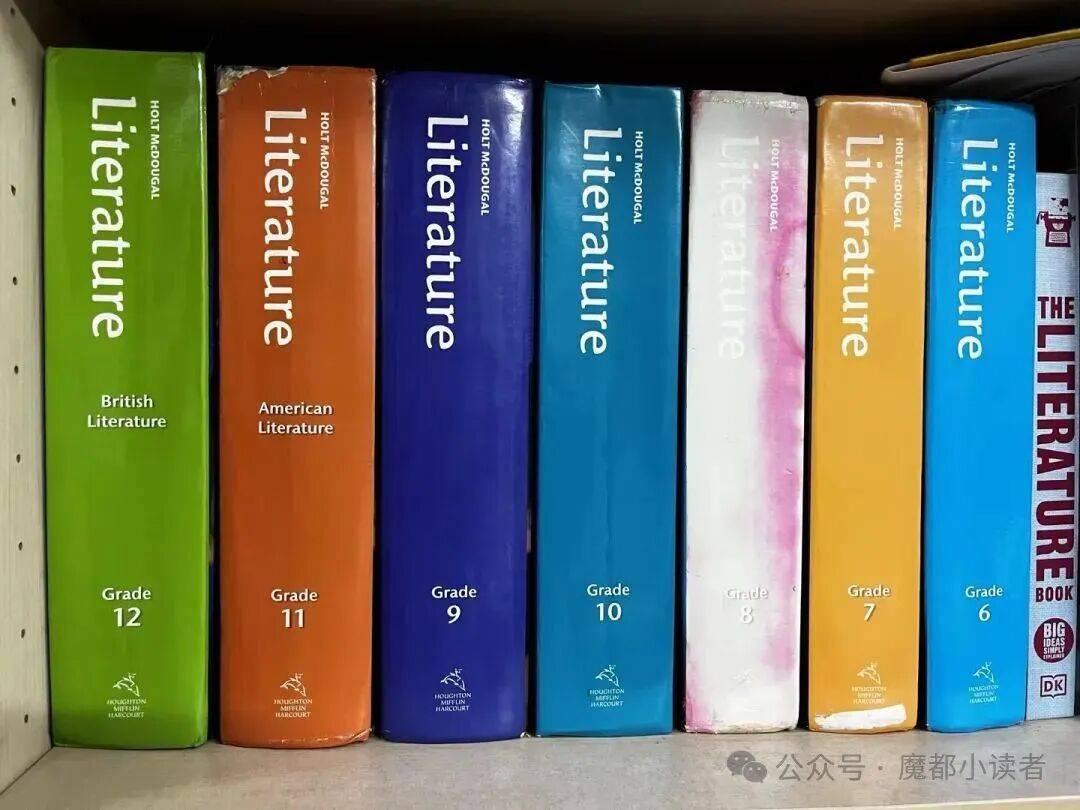 我几年前就开始搜集美国中学课本,美国语文6至12年级已经全部收藏了正版书,全是Holt McDougal出版社出版的彩印版。每本书的厚度都在1500页左右,用极薄又极有韧性的纸张彩印,像艺术品。