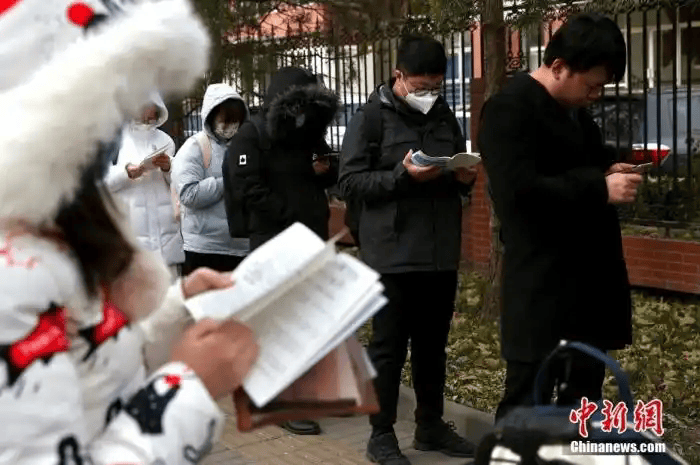 2023年11月26日,2024年国考当天举行,北京第十二中学校本部考点外,考生在入场前复习。中新社