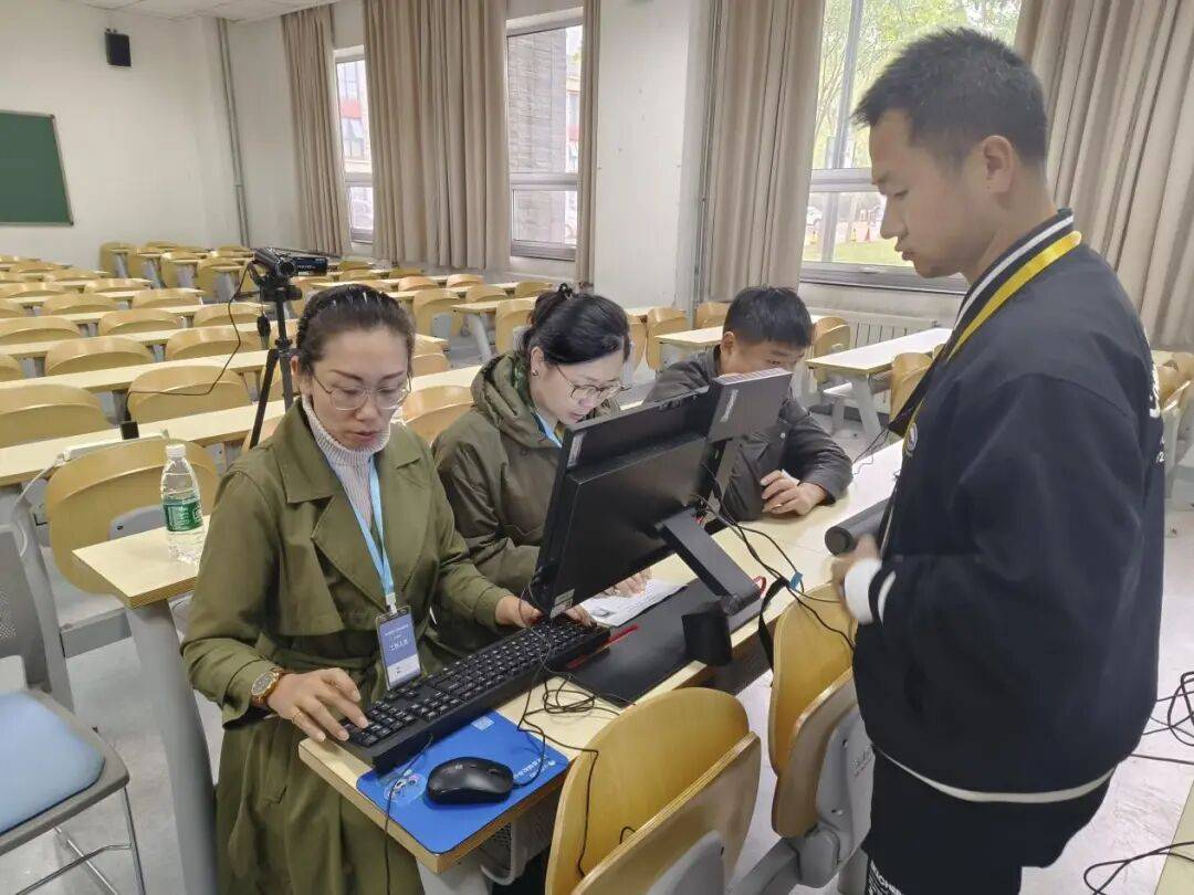 图为志愿者曹璐(左一)根据王先生口述内容进行机考文字内容录入