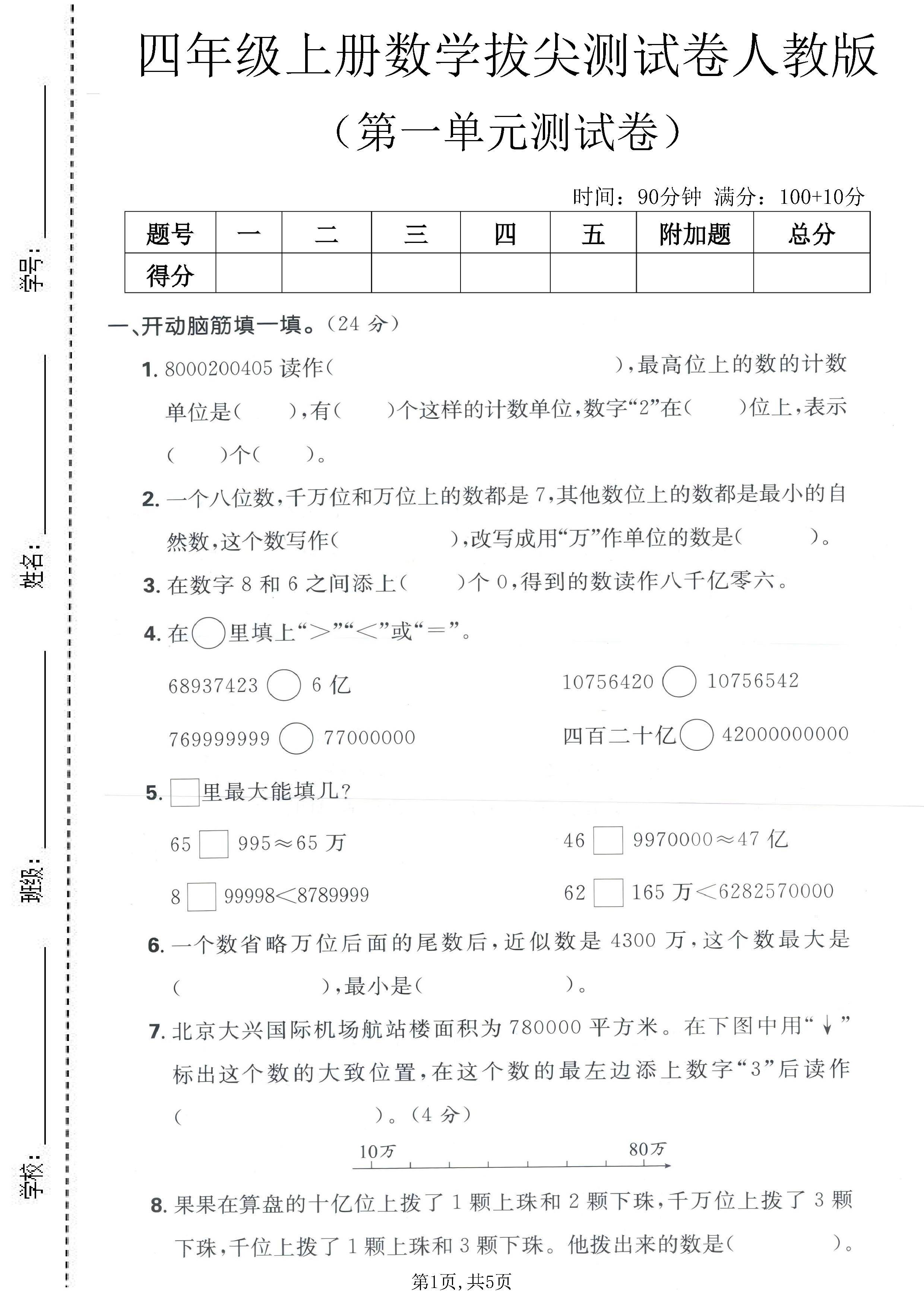 以下是四年级(上)数学第一单元《人教版》的知识点总结: