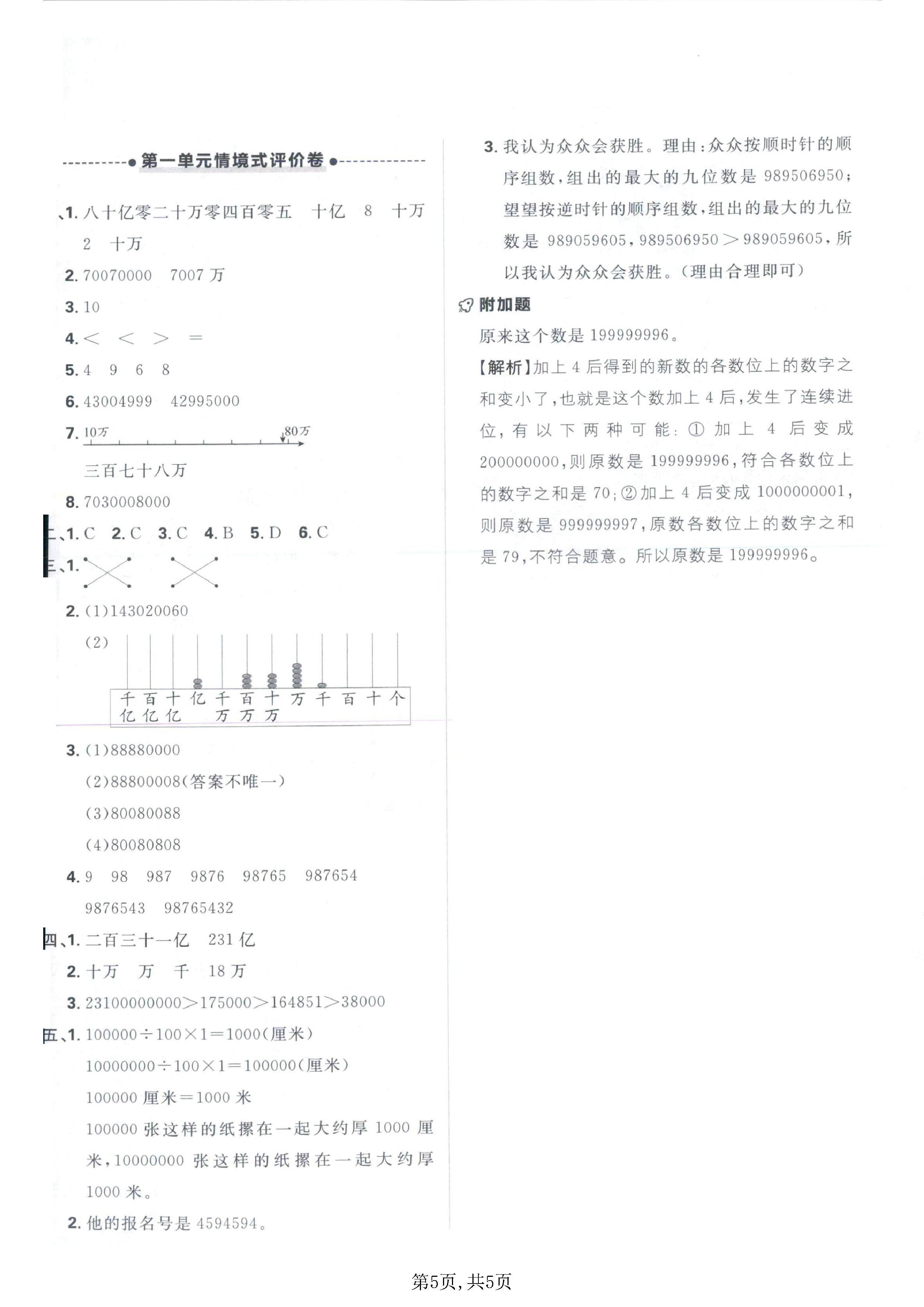 改写:去掉末尾的四个 0,将数写成用万作单位的数;去掉末尾的八个 0,将数写成用亿作单位的数。改写不改变数的大小,用 “=” 连接。