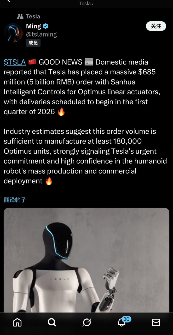 10月15日午间,市场传出消息称:特斯拉已向三花智控下达了价值6.85亿美元(约合50亿元人民币)的Optimus线性执行器订单,计划于2026年第一季度开始交付。业内估算,该订单量足以生产至少18万台Optimus机器人。