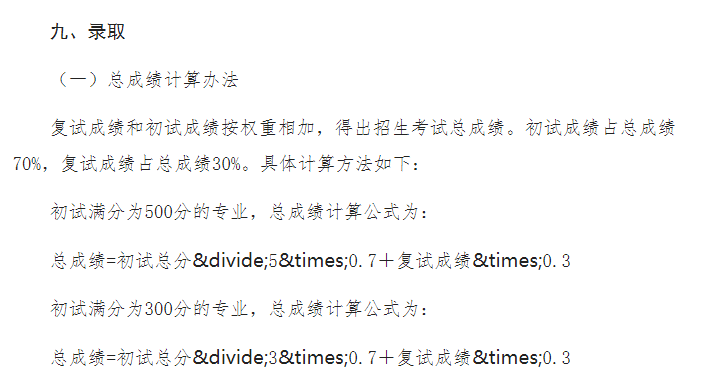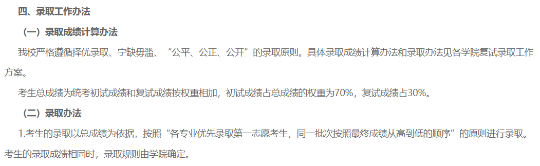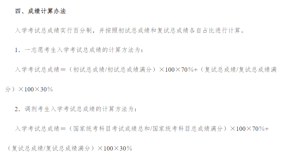 录取总成绩满分为100分,录取总成绩=折算成100分的初试成绩×70%+复试总成绩×30%。
