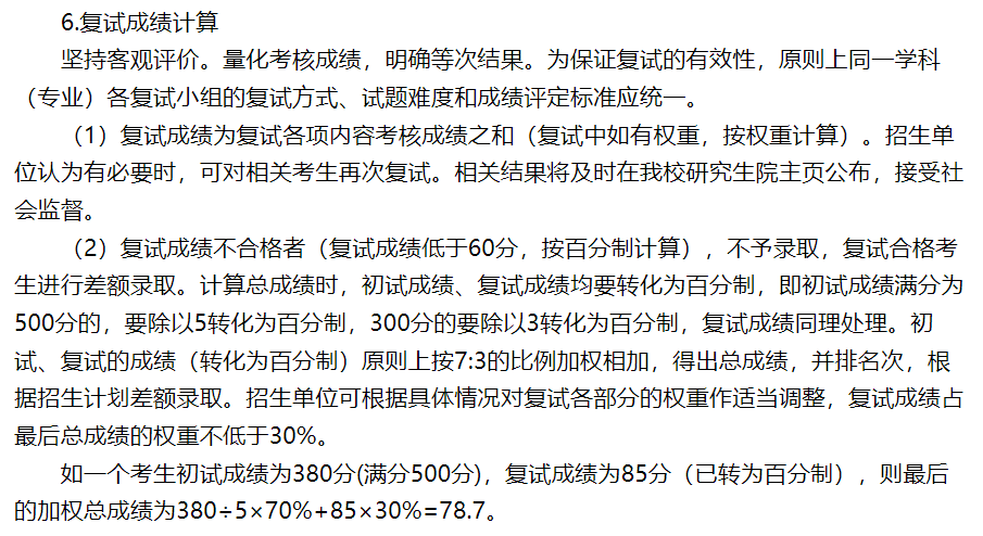按初试成绩与复试成绩7:3权重相加,计算出入学考试总成绩(保留两位小数点)。也就是说,初试成绩占总成绩的70%!