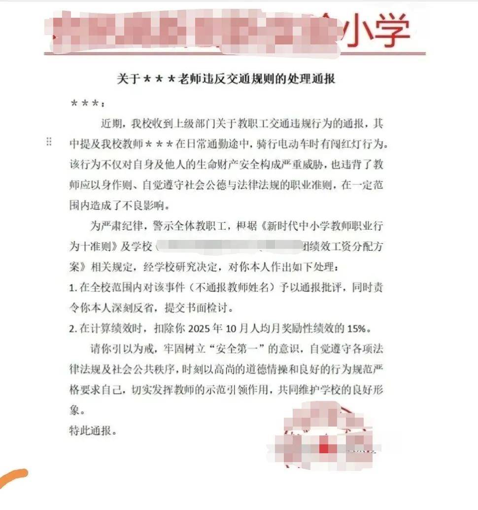 某地一位老师,因为骑电瓶车闯了红灯,被交警处罚后,事情并未结束。他所在的单位(学校)随后发布了一则通报:对该老师进行全校通报批评,并扣除当月绩效工资的15%。