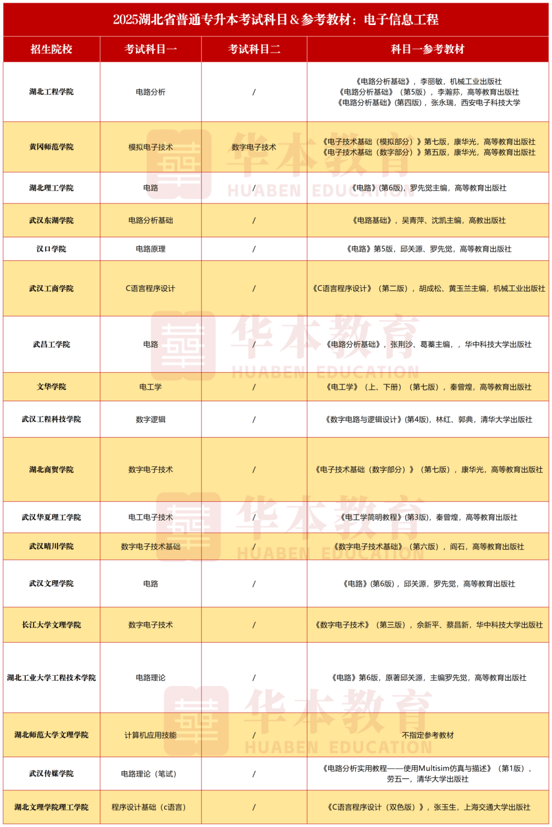 2025年湖北专升本,电子信息工程普通考生招生计划966人,相较于2024年扩招72人。招生院校上,新增两所院校,停招3所院校,停招的3所院校中,有一所公办院校,在公办院校数量减少的情况下,25年公办招生人数有一定增加。考试科目上,《电路》这门专业课考察的院校最多,电路这门专业课有一定的难度,建议早些开始专业课的备考复习。