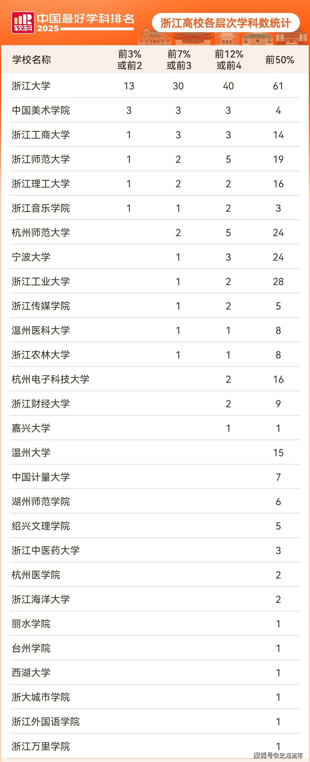 目前全省拥有浙江大学、中国美术学院、宁波大学3所“双一流”建设高校,其中浙江大学作为综合性研究型大学,综合排名长期稳居全国前三,在第五轮学科评估中斩获19个A+学科,形成覆盖文、理、工、医、农的全方位学科优势。