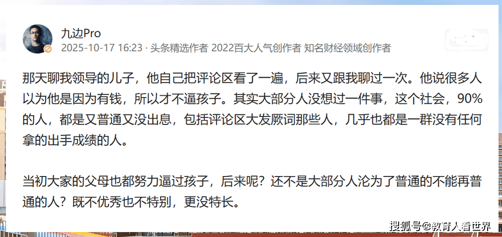 10月7日,知名财经自媒体作者九边讲了他领导的观点。领导和他说,自己的部下都是985毕业生,优秀的孩子都有很特别的地方,再对着自己儿子一看,儿子太普通了,没有那些优秀特质!既然是普娃,为啥就不能做一个轻松的普娃呢?非要各种折腾,最后心不甘情不愿地做上普通人?教育是筛选,大厂是筛选,发财也是筛选,这个世界的本质就是筛选,而不是培养。所以他不愿意逼自家儿子,这和他有没有钱没有关系。