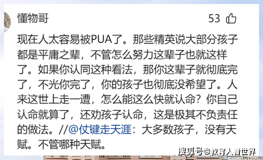有网友不赞同,认为,那些精英说大部分孩子都是平庸之辈,不管怎么努力这辈子也就这样了。如果你认同这种看法,那你这辈子就彻底完了,不光你完了,你的孩子也彻底没希望了。人来这世上走一遭,怎么能这么快就认命?你自己认命就算了,还劝孩子认命,这是极其不负责任的做法。