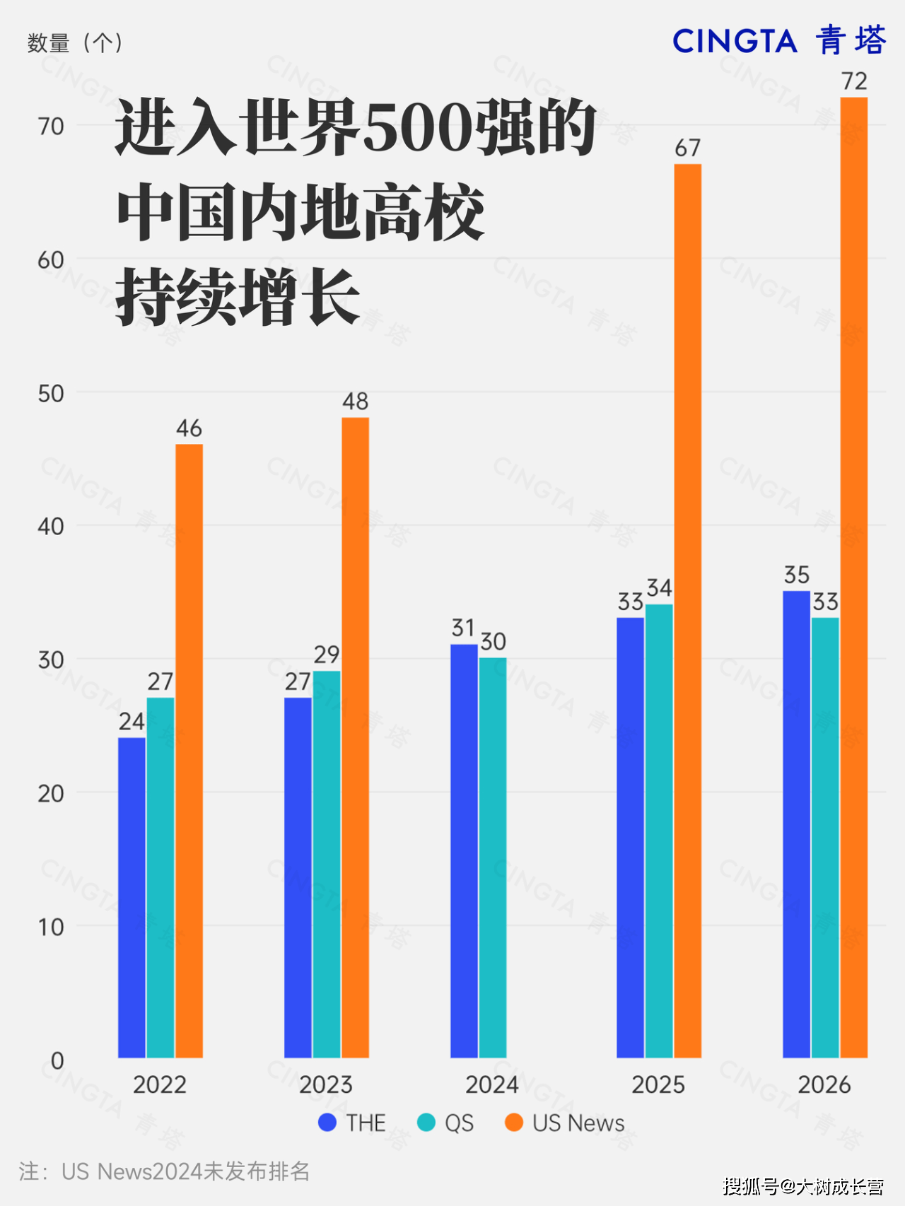 纵观2022至2026年多个排名周期,进入世界500强的中国内地高校数量呈现稳健增长态势。在U.S. News排名中,此类高校已从46所跃升至72所;而在THE与QS排名中,进入全球500强的高校也均突破30所;在软科榜单中,中国高校在全球百强中的数量逐年增加,从2021年的9所增至2025年的13所。