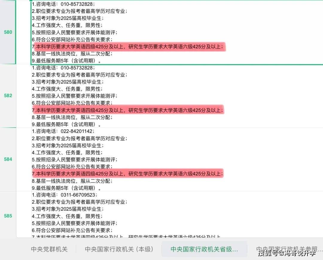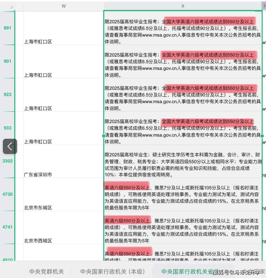 先看最让人崩溃的中央机关岗位。中央国家行政机关(本级)的不少岗位,明确要求四六级 425 分以上,报名时还得填分数。我高中同学小周就是典型,今年想报商务部的综合管理岗,笔试、面试准备了大半年,结果打开岗位表一看,“英语六级成绩不低于 425 分” 的要求直接把他拦在门外 —— 他四级刚过线,六级考了三次都差几分。小周无奈说:“早知道国考这么卡英语,大学时就不该偷懒,现在连报名资格都没有,太后悔了!”