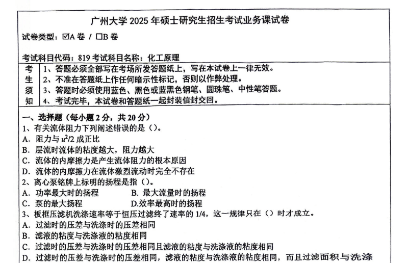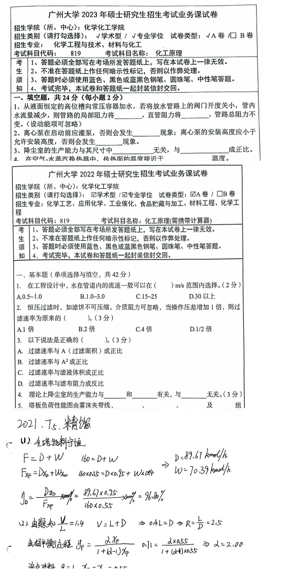 2010-2021年广州大学819化工原理考研真题手写版本答案
