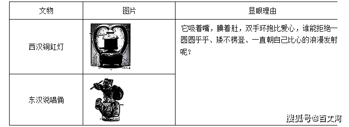 22.在浩瀚的历史文化遗产中,有一批造型独特、憨态可掬的文物㮞外引人注目,被网友们亲切地称为博物馆里的“显眼包”。下表中网友给出了“会比心”的西汉铜红灯的显眼理由,请你仿照其为东汉说唱俑写一个显眼理由,要求至少使用一种修辞。(6分)