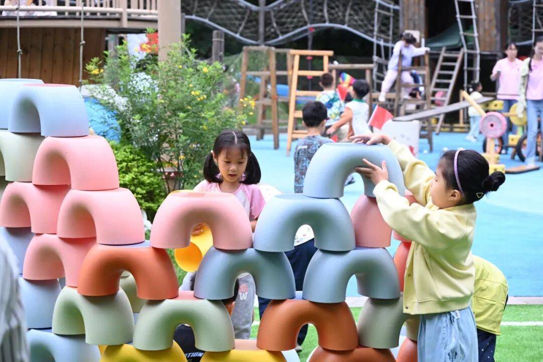 瞧,孩子们如同灵动的小精灵,在广阔的游戏场地里自由穿梭。他们全神贯注地沉浸在自己的游戏世界中,眼神里满是专注与认真。有的孩子在小舞台上尽情的表演,享受着音乐带来的美好享受;有的孩子围坐在沙水区,用小铲子和小桶构建着心中的梦幻城堡;还有的孩子在搭建区,齐心协力地搭建着高架桥和建筑物,每一次成功的拼接都让他们欢呼雀跃。