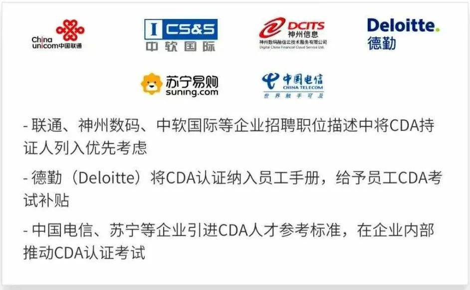 CDA企业认可度非常高,很多企业招聘时注明CDA数据分析师优先,对找工作非常有帮助。很多银行、金融机构的技术岗会要求必须是CDA数据分析师二级以上的持证人。中国联通、央视广信、德勤、苏宁等企业,把CDA持证人列入优先考虑或者对员工的CDA考试给补贴。