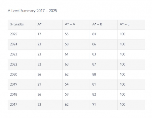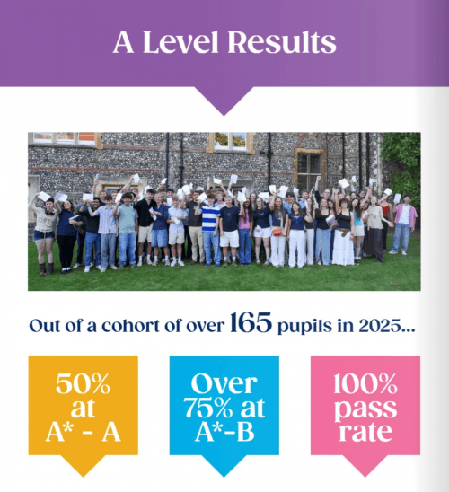 学校在2025年的学术表现持续亮眼:A-Level考试中52%的成绩达到A*-A,GCSE考试中74%的成绩获得9-7分(相当于A*-A)。在毕业去向上,近半毕业生进入英国前十大学,76%的学生入读英国前二十高校,展现出卓越的升学竞争力。