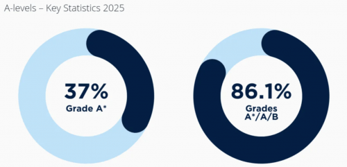 学校在2025年A-Level考试中取得历史性突破:37%的成绩为A,86.1%的成绩达到A-B,通过率连续保持100%。优异的学业表现为学生打开了通往世界名校的大门,其中11%的毕业生获得牛津、剑桥录取,绝大多数学生进入罗素集团大学,亦有部分学子选择医学、艺术、设计等多元发展路径。