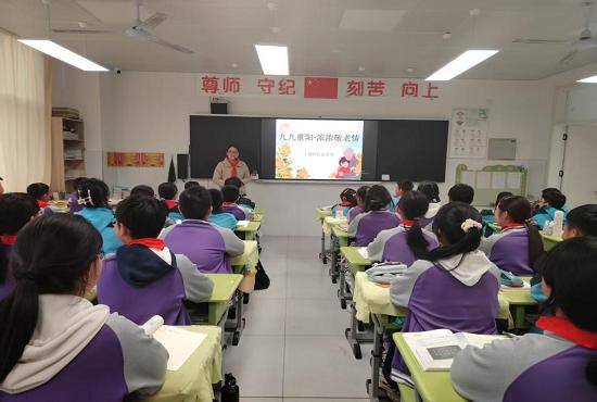 班队会上,各班活动形式丰富多样,文化氛围浓厚。班主任们通过生动的课件、趣味短视频与民间故事,向同学们系统讲解了重阳节的文化内涵:从“日月并阳、两九相重”的名称由来,到桓景剑斩瘟魔的古老传说,再到登高、赏菊、插茱萸、吃重阳糕等传统习俗,一个个鲜活的知识点让同学们对节日有了深刻认知 。“独在异乡为异客,每逢佳节倍思亲”,在诗词朗诵环节,同学们齐声诵读经典诗作,在朗朗书声中感受古人的思亲之情与节日的情感底蕴 。