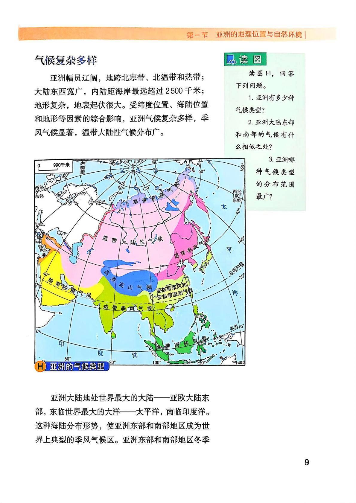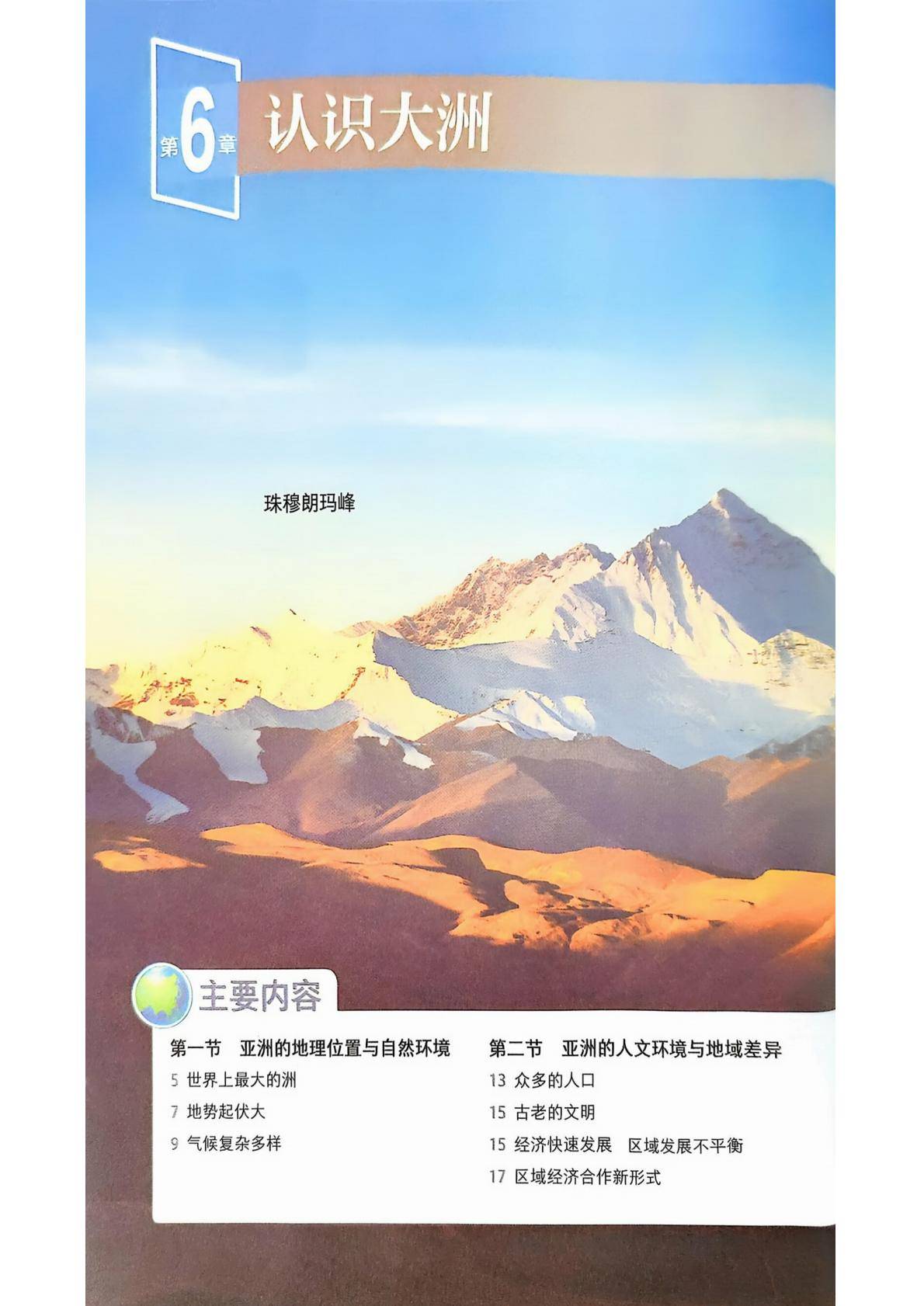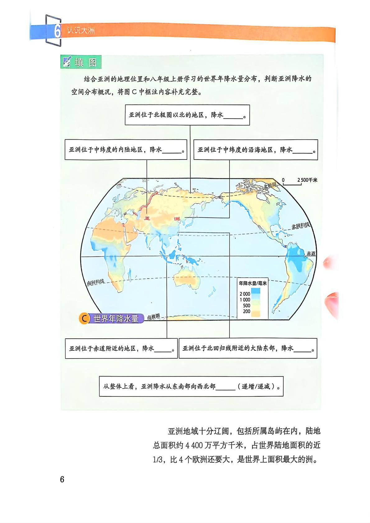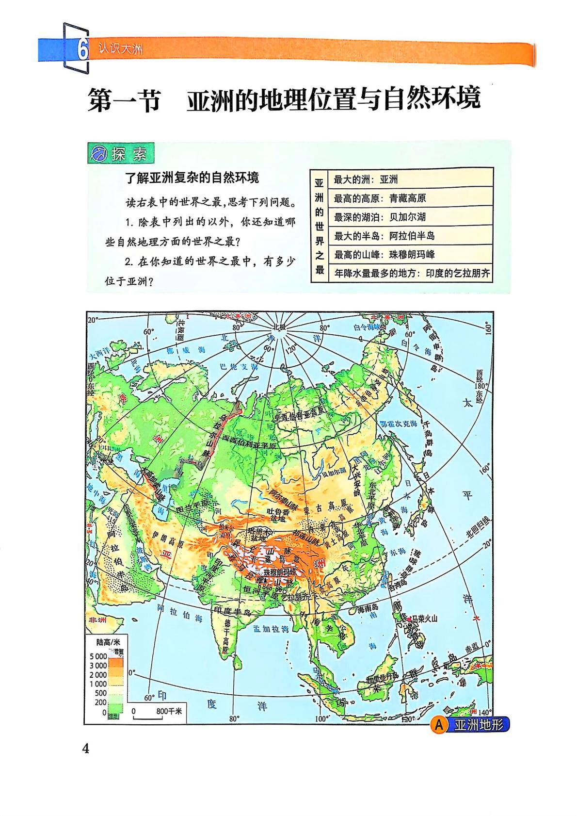 在内容方面,以亚洲为例,详细讲解了其气候(复杂多样、季风气候显著、温带大陆性气候分布广)、地形(地势起伏大、地形复杂多样)、地理位置(海陆分布、经纬度范围)等自然环境知识,同时涉及人文环境与地域差异。对于其他大洲、地区和国家,也从地理位置、自然特征、人文状况等角度进行剖析。此外,还融入了地理探究活动,如 “学会认识大洲” 的课题研究,以及跨学科主题学习,如家乡行道树现状优化、红色旅游景区开发等。