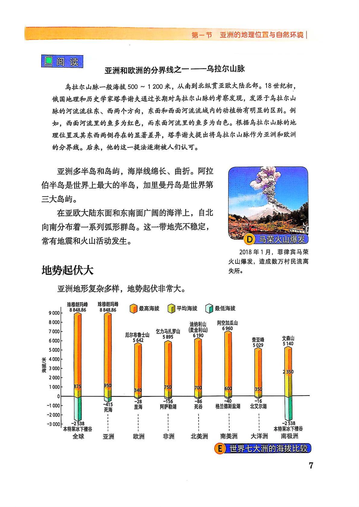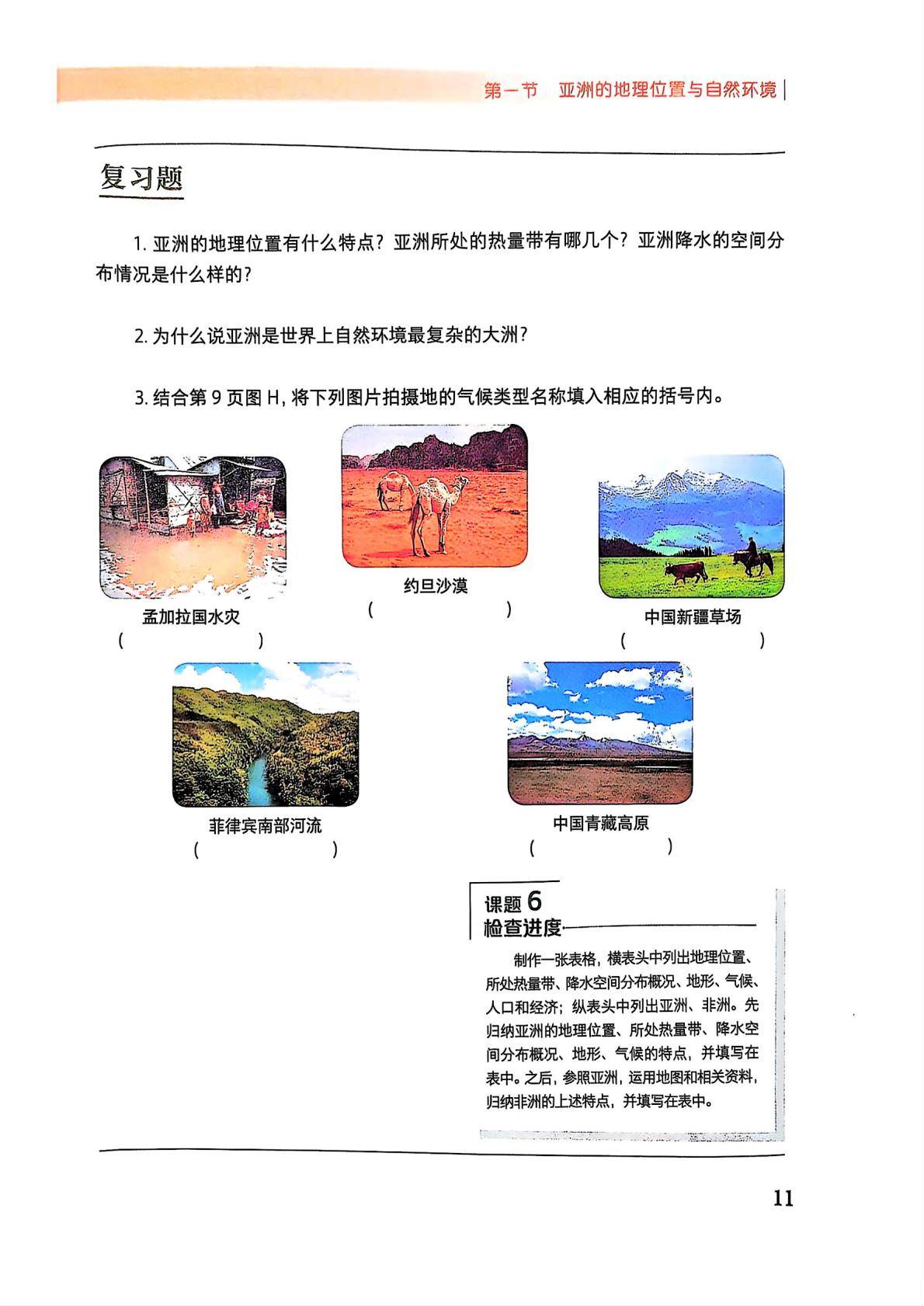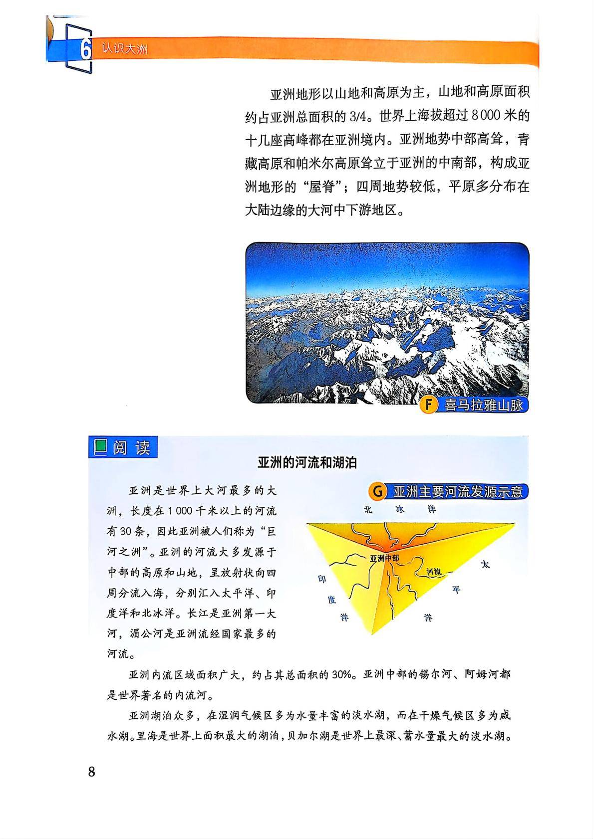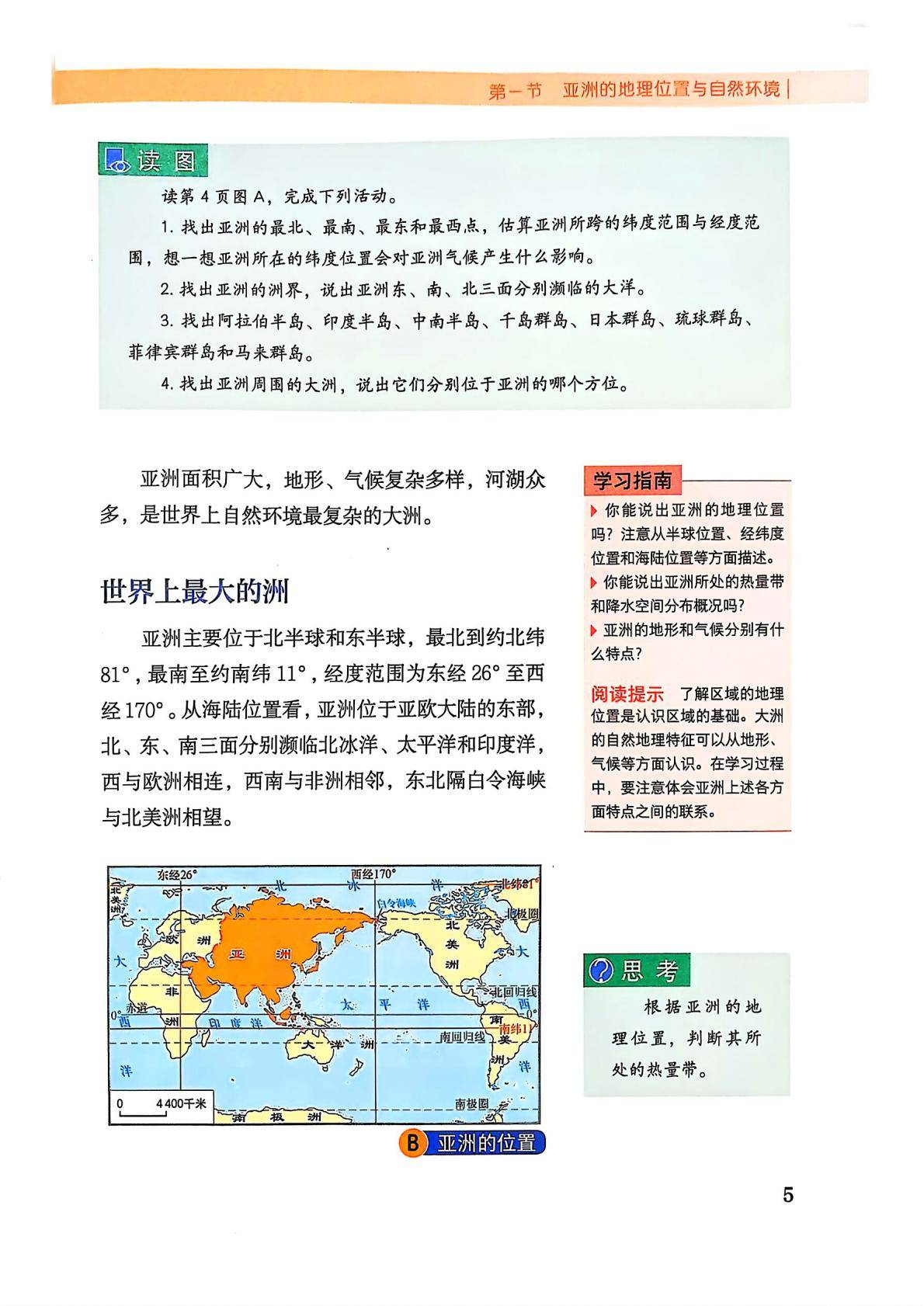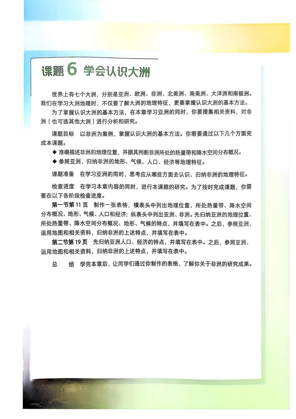 在内容方面,以亚洲为例,详细讲解了其气候(复杂多样、季风气候显著、温带大陆性气候分布广)、地形(地势起伏大、地形复杂多样)、地理位置(海陆分布、经纬度范围)等自然环境知识,同时涉及人文环境与地域差异。对于其他大洲、地区和国家,也从地理位置、自然特征、人文状况等角度进行剖析。此外,还融入了地理探究活动,如 “学会认识大洲” 的课题研究,以及跨学科主题学习,如家乡行道树现状优化、红色旅游景区开发等。