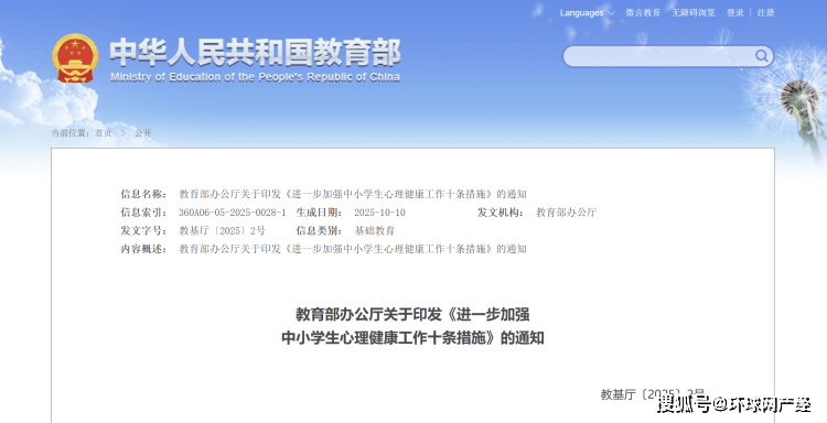 【环球网报道 记者 陈全】记者10月24日从教育部了解到,近日,教育部印发了《进一步加强中小学生心理健康工作十条措施》(以下简称《措施》)。《措施》旨在落实健康第一教育理念,进一步提高中小学生心理健康工作水平,并针对性根据中小学生心理健康阶段性特点和突出问题而制定。