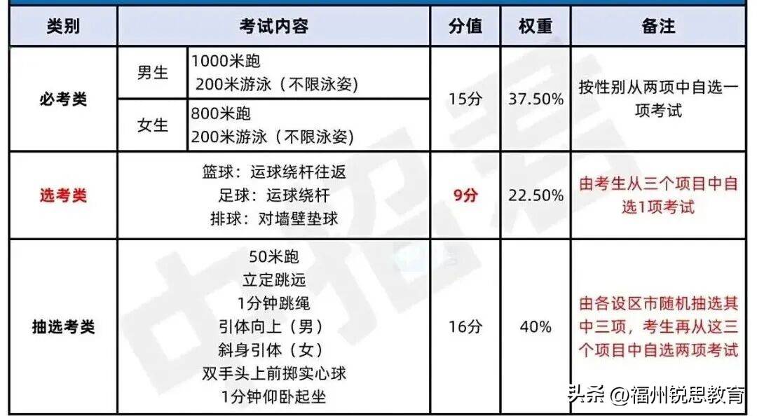 新的考试体系还将总分分为几类项目,具体如下:必考类15分,包括1000米或800米跑、200米游泳;选考类9分,涵盖“三大球”;抽选考类16分,包含50米跑、立定跳远、1分钟跳绳、引体向上/斜身引体、双手头上前掷实心球、1分钟仰卧起坐等多个项目。这些项目的测试细则和评分标准仍将依照《福建省初中毕业升学体育考试指导意见(试行)》和《福建省初中毕业升学体育与健康考试实施方案(试行)》执行。