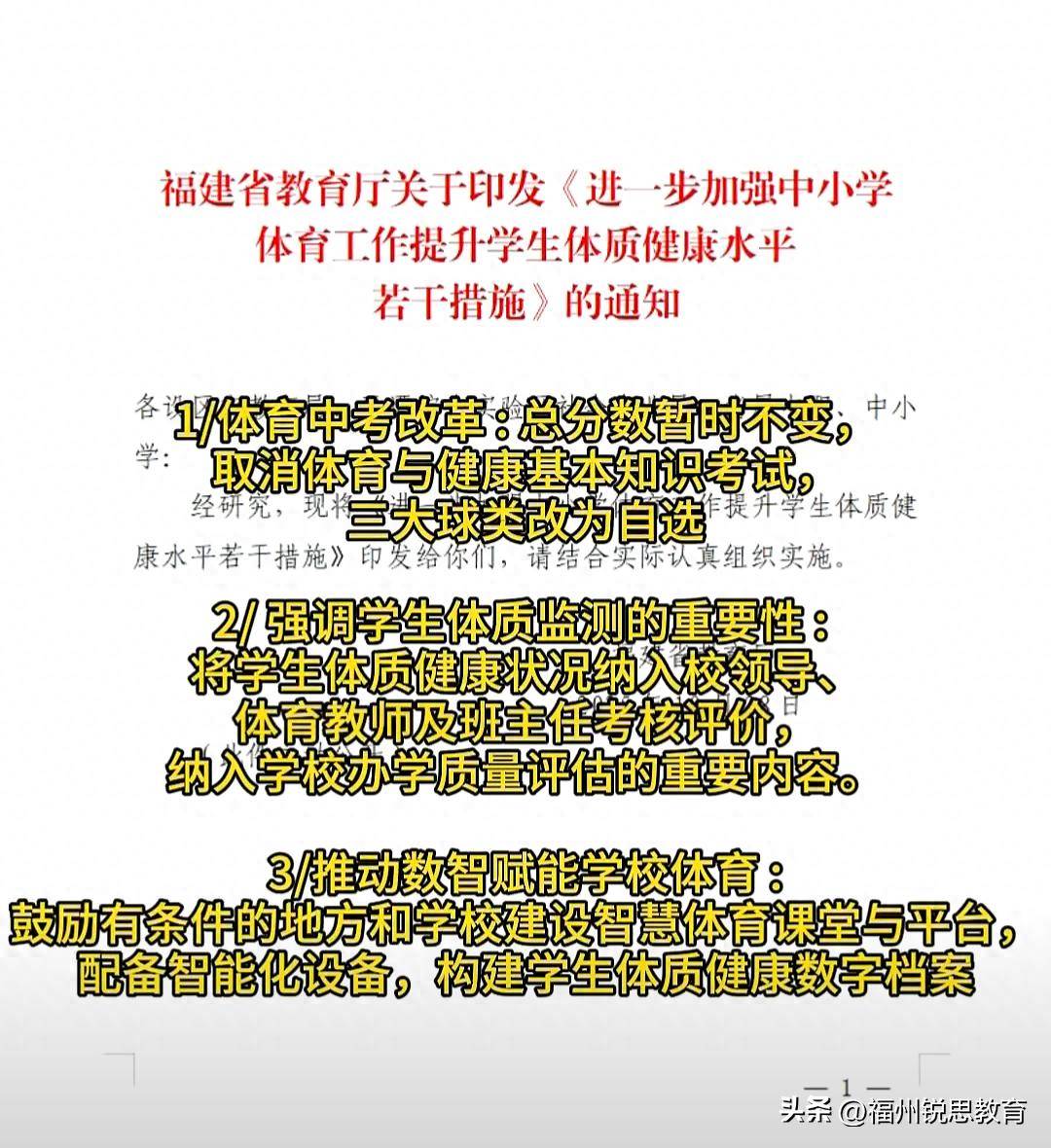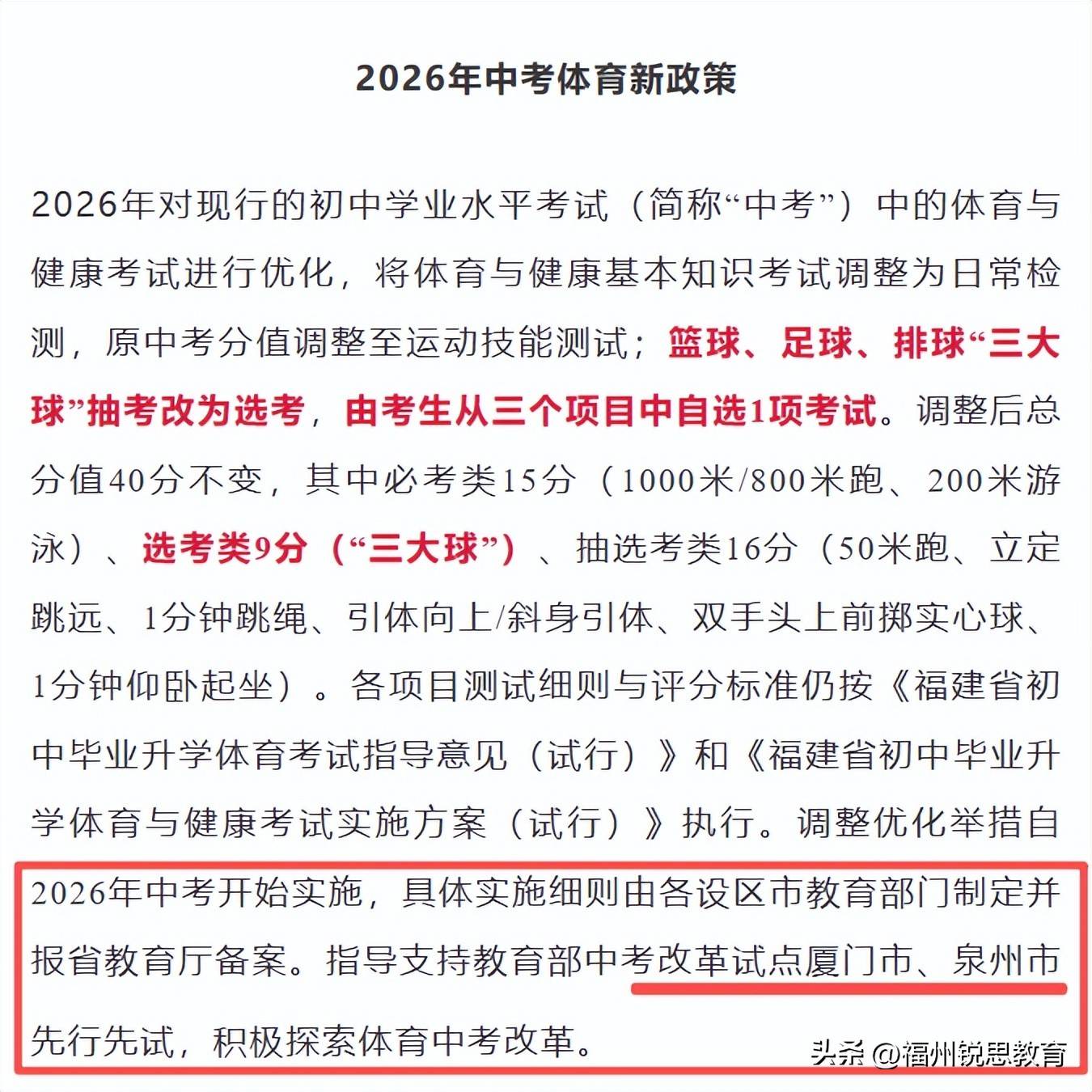福建省教育厅近日发布了一项关于2026年体育中考的重大改革通知。根据最新的政策,从2026年起,福建省将对现行的初中学业水平考试(简称“中考”)中的体育与健康考试进行优化,实施一系列新举措。