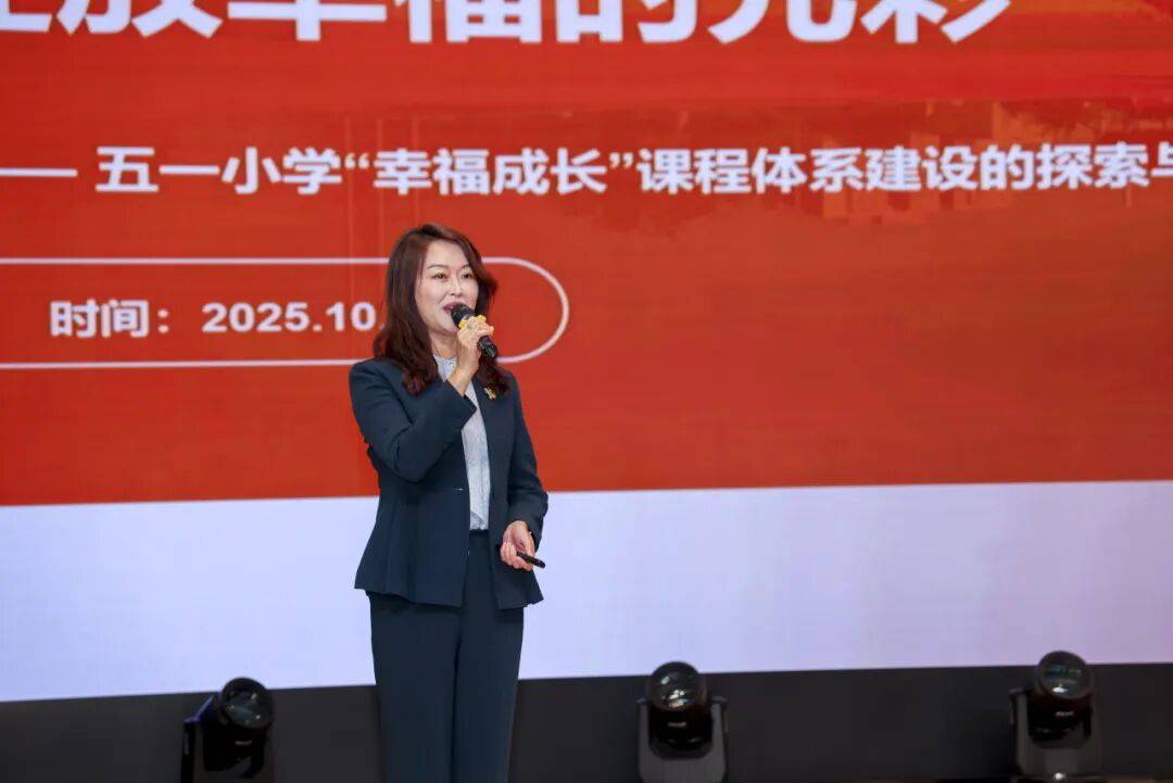 五一小学校长闫志玮以《让每一个生命绽放幸福的光彩》为题作成果报告,回望了五一“幸福成长”课程体系的建设之路。她指出,五一的教育是“让每个孩子都能被看见、被认可,在正向的期待中形成‘我能行、我能更好’的自信,长成幸福的模样”。幸福,不是终点,而是孩子们在成长中不断超越自我的力量。