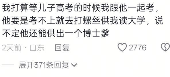 到时候爸爸考上了儿子没考上,就靠儿子打螺丝供爸爸上大学了,说不定还能供出一个博士爹!