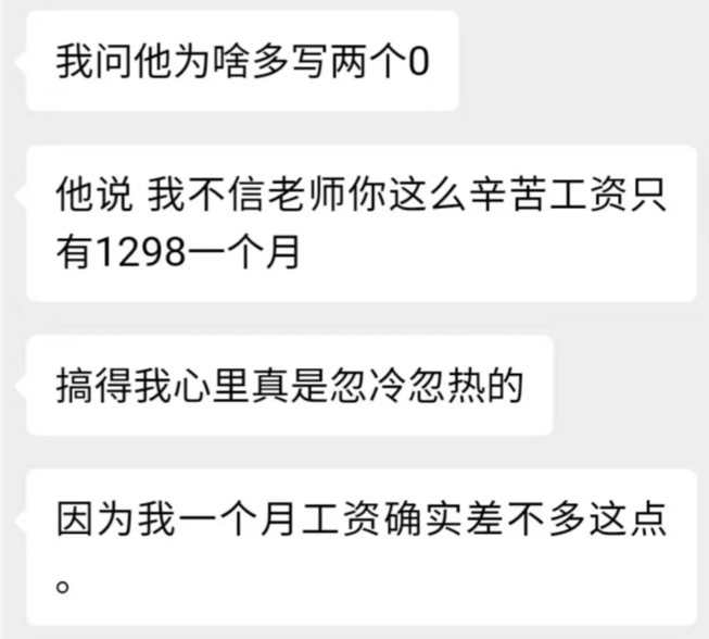 “我不信老师你这么辛苦工资只有1298一个月。”