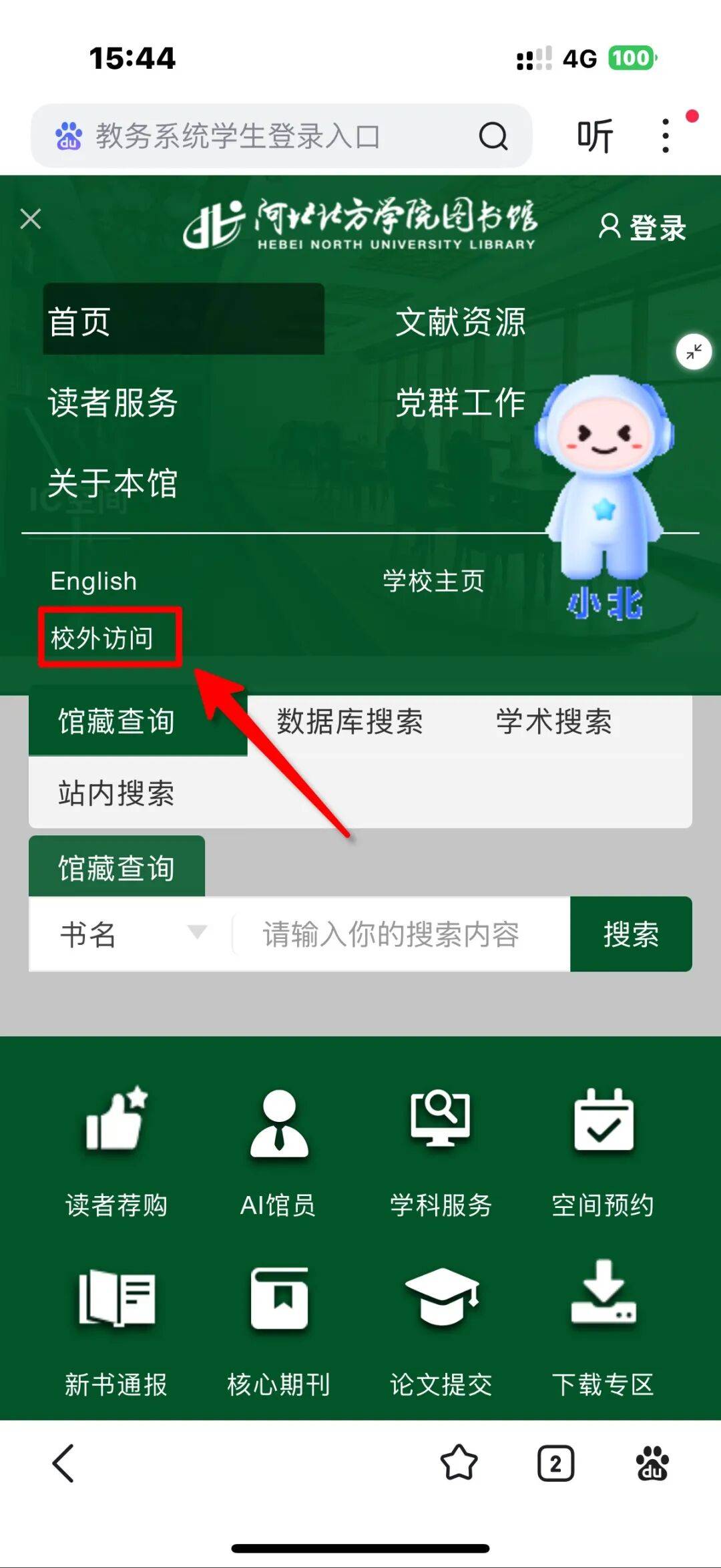 一、手机端打开“河北北方学院图书馆”主页,标,再点击“校外访问”,进行登录。