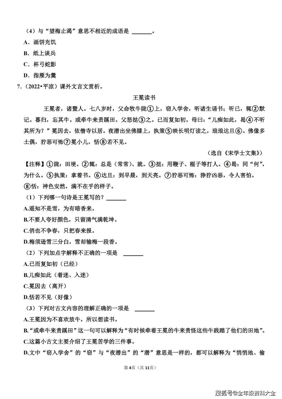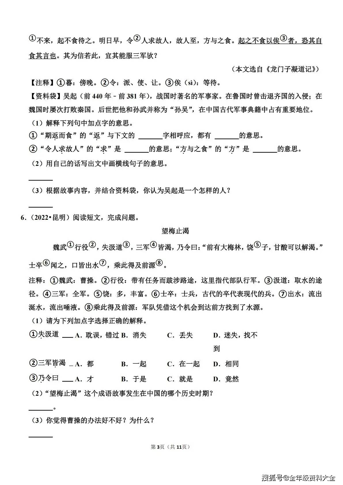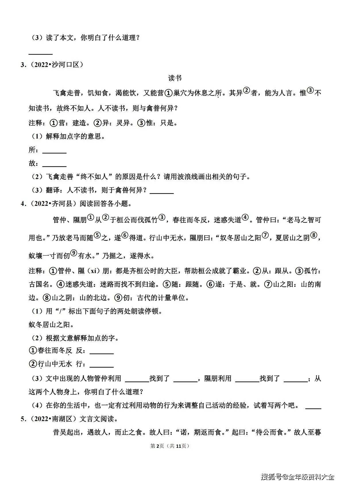 这份真题的题目类型设计得十分全面,能多维度打磨孩子的文言文阅读能力。既有夯实基础的字词解释题,让孩子掌握文言文中高频实词、虚词的含义;也有核心的句子翻译题,考验孩子将文言语句精准转化为通顺现代汉语的能力;更有侧重深层理解的题目,比如分析文言文的内容脉络与蕴含的道理,体会文中人物的性格特点与精神品质等。每类题目层层递进,从基础知识点到深层解读能力,全方位覆盖文言文学习的核心需求。